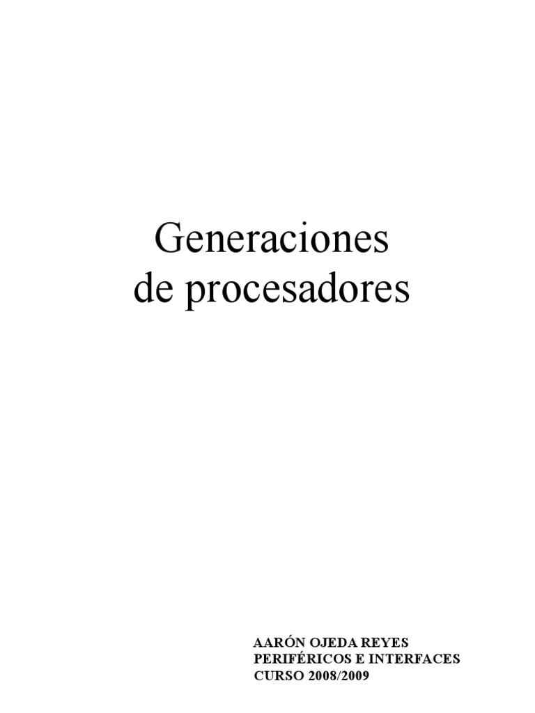 INTRODUCCIN Mucho ha llovido ya desde que Intel lanzara el primer microprocesador en un simple chip, el Intel 4004. A partir de entonces se han ido sucediendo lanzamientos de nuevos y mejorados procesadores. En este documento he hecho un recorrido desde la considerada primera generacin de procesadores hasta los procesadores de doble ncleo que copan hoy el mercado. Comenzar hablando de la primera generacin, que tiene como estandarte al procesador Intel 8086. Posteriormente comentar la segunda generacin, representada por el 286. A continuacin se produce un salto importante, pues entramos en la era de los 32 bits, con el flamante Intel 80386. La cuarta generacin (486) supone bsicamente un aumento del rendimiento del 386, y en la quinta generacin nos encontramos con los archiconocidos Pentium. La sexta generacin versar sobre la mejora de los citados Pentium, y se dividir en dos partes: sexta generacin de Intel y sexta generacin de otros fabricantes. La sptima generacin tiene como representante ms importante al Pentium 4 y en el tema dedicado a la octava generacin ya nos meteremos con los procesadores de 64 bits. Una vez analizadas las ocho generaciones de procesadores, comentar las caractersticas de los procesadores de doble ncleo, y por ltimo tenemos dos apartados dedicados a mejoras y actualizaciones, y al curioso tema de los nombres cdigo de los procesadores. Es importante resaltar que el tema de los procesadores est dividido en tres trabajos: uno correspondiente a los procesadores en s como elemento del PC, otro dedicado a la fabricacin e instalacin de dichos procesadores, y el que nos ocupa, dedicado a las generaciones de procesadores. Como es lgico, aspectos relacionados con los otros trabajos basados en procesadores aparecern con frecuencia, pero slo se mencionarn y como mucho se describirn someramente.