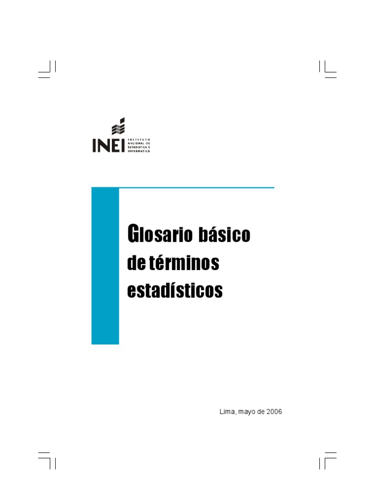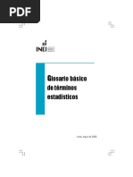 El Instituto Nacional de Estadstica e Informtica (INEI), a travs del Centro de Investigacin y Desarrollo, continuando con su poltica de difusin y fortalecimiento de la cultura estadstica, pone a disposicin de los usuarios interesados en conocer los conceptos bsicos de la ciencia estadstica el documento Glosario bsico de trminos estadsticos. La estadstica es la ciencia que se ocupa del estudio de fenmenos de tipo genrico, en el mbito social y econmico, normalmente complejos y enmarcados en un universo variable. Emplea modelos de reduccin de la informacin y de anlisis de validacin de los resultados en trminos de representatividad. La informacin puede ser numrica o alfabtica. Una de las ramas de la ciencia estadstica es la estadstica descriptiva, que se encarga desde la recoleccin, procesamiento, anlisis y hasta la presentacin de un conjunto de datos, mediante las denominadas medidas de posicin, dispersin, forma y concentracin, con el fin de describir, apropiadamente, ese conjunto de datos. La otra rama es la estadstica inferencial que se refiere al mtodo para lograr generalizaciones acerca de las propiedades del todo. Usualmente el trmino estadstica se utiliza como sinnimo de dato. Sin embargo una informacin numrica cualquiera puede no constituir una estadstica. Para merecer esta denominacin, los datos han de constituir un conjunto coherente, organizado de forma sistemtica y siguiendo un criterio de ordenacin. El presente documento comprende los trminos ms usuales de la estadstica. Los conceptos incluidos son de fcil comprensin y permiten conocer las definiciones elementales del argot estadstico, ordenadas alfabticamente. El INEI espera contribuir con esta publicacin al manejo bsico de los trminos estdsticos includos. Lima, mayo de 2006