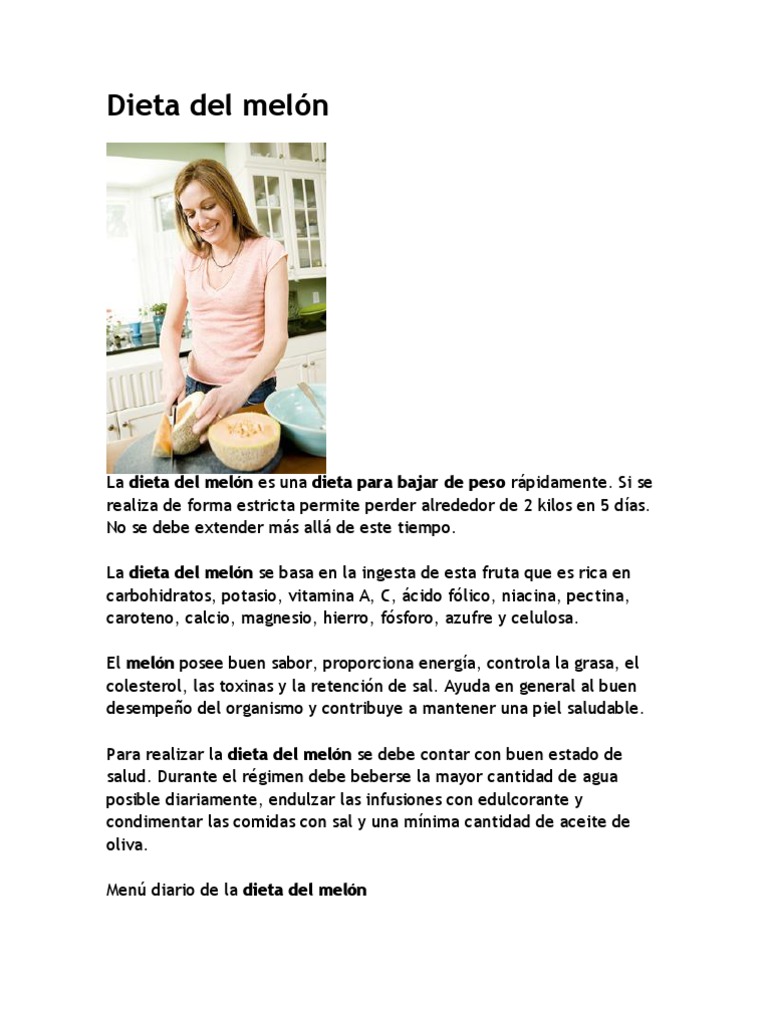 La dieta del meln es una dieta para bajar de peso rpidamente. Si se realiza de forma estricta permite perder alrededor de 2 kilos en 5 das. No se debe extender ms all de este tiempo. La dieta del meln se basa en la ingesta de esta fruta que es rica en carbohidratos, potasio, vitamina A, C, cido flico, niacina, pectina, caroteno, calcio, magnesio, hierro, fsforo, azufre y celulosa. El meln posee buen sabor, proporciona energa, controla la grasa, el colesterol, las toxinas y la retencin de sal. Ayuda en general al buen desempeo del organismo y contribuye a mantener una piel saludable. Para realizar la dieta del meln se debe contar con buen estado de salud. Durante el rgimen debe beberse la mayor cantidad de agua posible diariamente, endulzar las infusiones con edulcorante y condimentar las comidas con sal y una mnima cantidad de aceite de oliva. Men diario de la dieta del meln