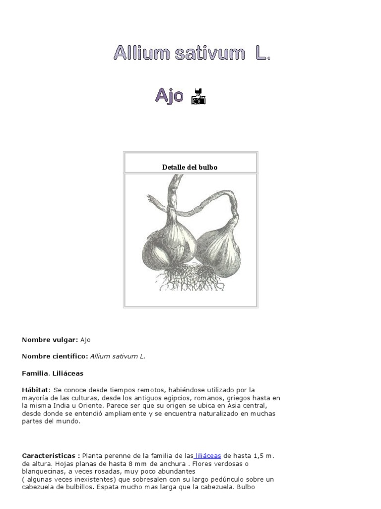 En todo caso es conveniente consultar con el mdico, farmacutico o dietista en para evitar posibles contraindicaciones. En ningn caso deben utilizarse diferentes preparados de este al mismo tiempo ( cpsulas, tinturas, extractos etc.) Para evitar problemas es mejor tomar este producto de una forma natural. Planta perenne de la familia de las liliceas de hasta 1,5 m. de altura. Hojas planas de hasta 8 mm de anchura . Flores verdosas o blanquecinas, a veces rosadas, muy poco abundantes ( algunas veces inexistentes) que sobresalen con su largo pednculo sobre un cabezuela de bulbillos. Espata mucho mas larga que la cabezuela. Bulbo ( cabeza de ajo )formado por una envoltura blanca dentro de la cual se encuentran varios bulbillos ( Los dientes de ajo). Florece de agosto a septiembre Se conoce desde tiempos remotos, habindose utilizado por la mayora de las culturas, desde los antiguos egipcios, romanos, griegos hasta en la misma India u Oriente. Parece ser que su origen se ubica en Asia central, desde donde se extendi ampliamente. No aparece naturalizado.