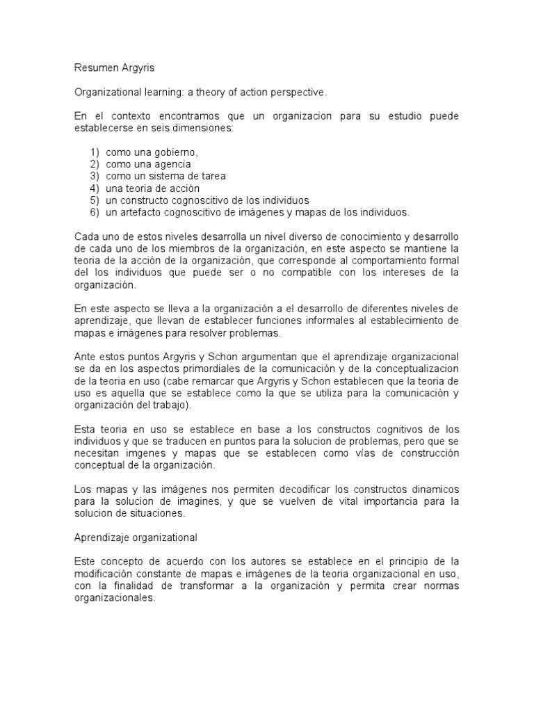 Cada uno de estos niveles desarrolla un nivel diverso de conocimiento y desarrollo de cada uno de los miembros de la organizacin, en este aspecto se mantiene la teoria de la accin de la organizacin, que corresponde al comportamiento formal del los individuos que puede ser o no compatible con los intereses de la organizacin. En este aspecto se lleva a la organizacin a el desarrollo de diferentes niveles de aprendizaje, que llevan de establecer funciones informales al establecimiento de mapas e imgenes para resolver problemas. Ante estos puntos Argyris y Schon argumentan que el aprendizaje organizacional se da en los aspectos primordiales de la comunicacin y de la conceptualizacion de la teoria en uso (cabe remarcar que Argyris y Schon establecen que la teoria de uso es aquella que se establece como la que se utiliza para la comunicacin y organizacin del trabajo). Esta teoria en uso se establece en base a los constructos cognitivos de los individuos y que se traducen en puntos para la solucion de problemas, pero que se necesitan imgenes y mapas que se establecen como vas de construccin conceptual de la organizacin. Los mapas y las imgenes nos permiten decodificar los constructos dinamicos para la solucion de imagines, y que se vuelven de vital importancia para la solucion de situaciones. Aprendizaje organizational Este concepto de acuerdo con los autores se establece en el principio de la modificacin constante de mapas e imgenes de la teoria organizacional en uso, con la finalidad de transformar a la organizacin y permita crear normas organizacionales.