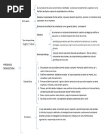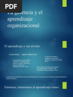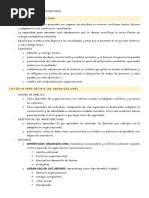 Aprendizaje de giro sencillo Miembros de la organizacin responde a los cambios en los ambientes internos y externos por la deteccin de los errores que ellos pueden corregir as como mantener constructos de la teoria en uso organizacional, la organizacin se manetiene estable en este contexto en base al aprendizaje. En cuestin de aprendizaje los individuos se vuelven agentes de la accin organizacional y del aprendizaje organizacional, en este caso el aprendizaje organizacional se debe en gran parte a las expectativas de los individuos y de los errores que pueden resolver estableciendo estrategias que son capaces de asimila; y que los mismos individuos pueden redireccionar. A esto se le denomina aprendizaje de giro sencillo. Aprendizaje de doble giro En este caso el aprendizaje se detemina por las estretagias del aprendizaje de giro sencillo pero se complementan con la normatividad propia de la organizacin, y que a su vez se crea por medio del desarrollo de la situaciones inherentes. En este caso el aspecto tecnolgico, la innovacin y el desarrollo genera un nivel de aprendizaje dentro de la organizacin. En este tipo de aprendizaje se basa en la unidades inconsistentes y de sus requerimientos, que se ven reflejados en el conflicto y afectan los procesos. En este caso el aprendizaje de doble giro permite que los administradores confronten y resuelvan los conflictos de manera en que se tranfieren los requerimientos incompatibles al nivel interpersonal e intergrupal. En este caso el conflicto se determina en el planteamiento mismo del conflicto. Deutero aprendizaje (aprendizaje de segundo orden) Bateson Los miembros de la organizacin aprenden acerca del contexto del aprendizaje organizacional, este tipo de aprendizaje dentro de la organizacin se da en el mismo contexto de la curva de aprendizaje, poniendo nfasis en la efectividad del aprendizaje para resolver conflictos y establecer normas. La organizacin no solo son teorias de accin, son sociedades compuestas por personas que ocupan roles y tareas de sistema; que determinan el comportamiento de los individuos que las integran a traves de normas de instruccin que permiten una identidad y desarrollo de aprendizaje hacia el interior y el exterior de la organizacin.