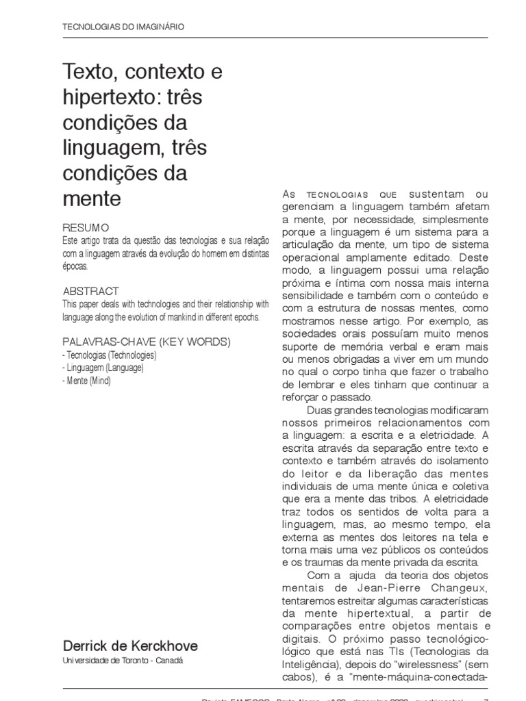 A S TECNOLOGIAS QUE sustentam ou gerenciam a linguagem tambm afetam a mente, por necessidade, simplesmente porque a linguagem um sistema para a articulao da mente, um tipo de sistema operacional amplamente editado. Deste modo, a linguagem possui uma relao prxima e ntima com nossa mais interna sensibilidade e tambm com o contedo e com a estrutura de nossas mentes, como mostramos nesse artigo. Por exemplo, as sociedades orais possuam muito menos suporte de memria verbal e eram mais ou menos obrigadas a viver em um mundo no qual o corpo tinha que fazer o trabalho de lembrar e eles tinham que continuar a reforar o passado. Duas grandes tecnologias modificaram nos sos primeiros relacionamentos com a linguagem: a escrita e a eletricidade. A escrita atravs da separao entre texto e contexto e tambm atravs do isolamento do leitor e da liberao das mentes individuais de uma mente nica e coletiva que era a mente das tribos. A eletricidade traz todos os sentidos de volta para a linguagem, mas, ao mesmo tempo, ela externa as mentes dos leitores na tela e torna mais uma vez pblicos os contedos e os traumas da mente privada da escrita. Com a ajuda da teoria dos objetos mentais de Jean-Pierre Changeux, tentaremos estreitar algumas caractersticas da men te hipertextual, a partir de com pa ra es entre objetos mentais e digitais. O pr xi mo passo tecnolgicolgico que est nas TIs (Tecnologias da Inteligncia), depois do wirelessness (sem cabos), a mente-mquina-conectada7