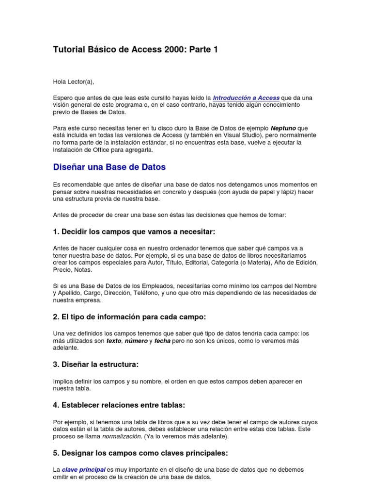 Hola Lector(a), Espero que antes de que leas este cursillo hayas ledo la Introduccin a Access que da una visin general de este programa o, en el caso contrario, hayas tenido algn conocimiento previo de Bases de Datos. Para este curso necesitas tener en tu disco duro la Base de Datos de ejemplo Neptuno que est incluida en todas las versiones de Access (y tambin en Visual Studio), pero normalmente no forma parte de la instalacin estndar, si no encuentras esta base, vuelve a ejecutar la instalacin de Office para agregarla.