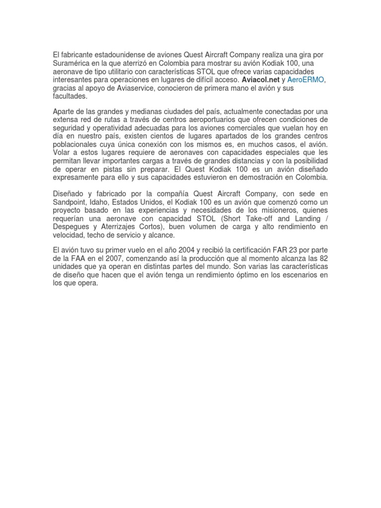 mostrar su avin Kodiak 100, una aeronave de tipo utilitario con caractersticas STOL que ofrece varias capacidades interesantes para operaciones en lugares de difcil acceso. Aviacol.net y AeroERMO, gracias al apoyo de Aviaservice, conocieron de primera mano el avin y sus facultades. Aparte de las grandes y medianas ciudades del pas, actualmente conectadas por una extensa red de rutas a travs de centros aeroportuarios que ofrecen condiciones de seguridad y operatividad adecuadas para los aviones comerciales que vuelan hoy en da en nuestro pas, existen cientos de lugares apartados de los grandes centros poblacionales cuya nica conexin con los mismos es, en muchos casos, el avin. Volar a estos lugares requiere de aeronaves con capacidades especiales que les permitan llevar importantes cargas a travs de grandes distancias y con la posibilidad de operar en pistas sin preparar. El Quest Kodiak 100 es un avin diseado expresamente para ello y sus capacidades estuvieron en demostracin en Colombia. Diseado y fabricado por la compaa Quest Aircraft Company, con sede en Sandpoint, Idaho, Estados Unidos, el Kodiak 100 es un avin que comenz como un proyecto basado en las experiencias y necesidades de los misioneros, quienes requeran una aeronave con capacidad STOL (Short Take-off and Landing / Despegues y Aterrizajes Cortos), buen volumen de carga y alto rendimiento en velocidad, techo de servicio y alcance. El avin tuvo su primer vuelo en el ao 2004 y recibi la certificacin FAR 23 por parte de la FAA en el 2007, comenzando as la produccin que al momento alcanza las 82 unidades que ya operan en distintas partes del mundo. Son varias las caractersticas de diseo que hacen que el avin tenga un rendimiento ptimo en los escenarios en los que opera.