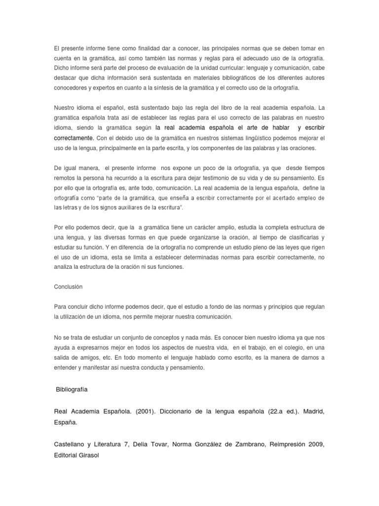 as como tambin las normas y reglas para el adecuado uso de la ortografa. Dicho informe ser parte del proceso de evaluacin de la unidad curricular: lenguaje y comunicacin, cabe destacar que dicha informacin ser sustentada en materiales bibliogrficos de los diferentes autores conocedores y expertos en cuanto a la sntesis de la gramtica y el correcto uso de la ortografa.