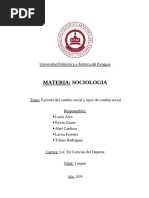 marxista ...hubiera llevado a resultados absolutamente correctos, de haber estado fundada sobre el principio de la correlacin de factores (p. 453). Lo anterior muestra que los factores econmicos influyen sobre la superestructura conformada por factores jurdicos, polticos e ideolgicos, pero, de acuerdo con esta postura, tambin puede ocurrir lo contrario. Valores Culturales Son factores que contribuyen a acelerar o retrasar el cambio; pero, al igual que los dems, operan en combinacin con otros factores. Dentro de estos, es muy importante el conocimiento cientfico; Augusto Comte identific a la sociedad moderna con el desarrollo del pensamiento cientfico; la sociedad positiva es, segn l, la sociedad cientfica. Sin embargo, este desarrollo de la sociedad est a su vez determinado por las polticas cientficas dependientes de las esferas gubernamentales y de inters econmico Procesos polticos Resultado de factores que buscan un mayor ejercicio de participacin de la ciudadana, permitiendo una ampliacin de sus libertades e igualdades, tanto en el plano democrtico, como humano y que permitan su autonoma y desarrollo, de una bsqueda del equilibrio tanto entre los poderes del Estado, como entre las fuerzas de los grupos que compiten por el poder. Naturales Factores que se presentan como resultado de la dinmica de la naturaleza misma, y que conlleva a establecer la necesidad de enfrentar los fenmenos naturales, de una manera ms eficaz para evitar desgracias sociales y econmicas.