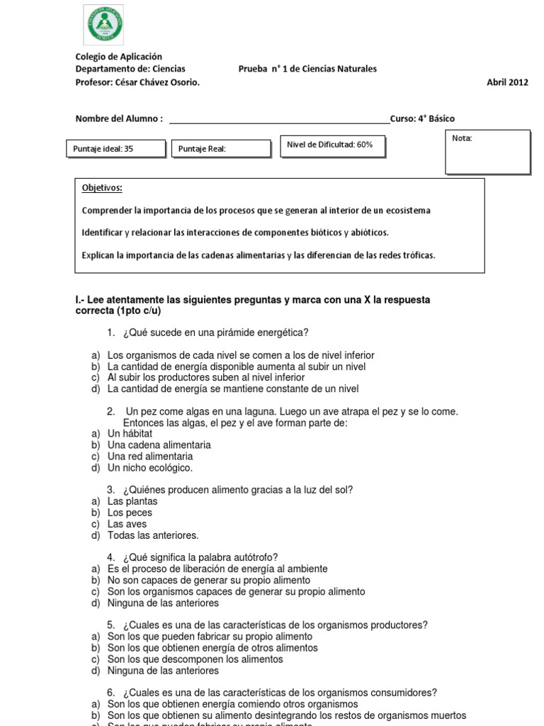 I.- Lee atentamente las siguientes preguntas y marca con una X la respuesta correcta (1pto c/u) 1. Qu sucede en una pirmide energtica? a) b) c) d) Los organismos de cada nivel se comen a los de nivel inferior La cantidad de energa disponible aumenta al subir un nivel Al subir los productores suben al nivel inferior La cantidad de energa se mantiene constante de un nivel 2. a) b) c) d) Un pez come algas en una laguna. Luego un ave atrapa el pez y se lo come. Entonces las algas, el pez y el ave forman parte de: Un hbitat Una cadena alimentaria Una red alimentaria Un nicho ecolgico.