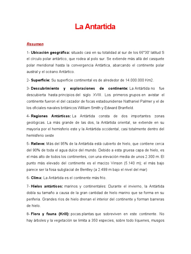Resumen 1- Ubicacin geogrfica: situado casi en su totalidad al sur de los 6630' latitud S el crculo polar antrtico, que rodea al polo sur. Se extiende ms all del casquete polar meridional hasta la convergencia Antrtica, abarcando el continente polar austral y el ocano Antrtico. 2- Superficie: Su superficie continental es de alrededor de 14.000.000 Km2. 3- Descubrimiento y exploraciones de continente: La Antrtida no fue