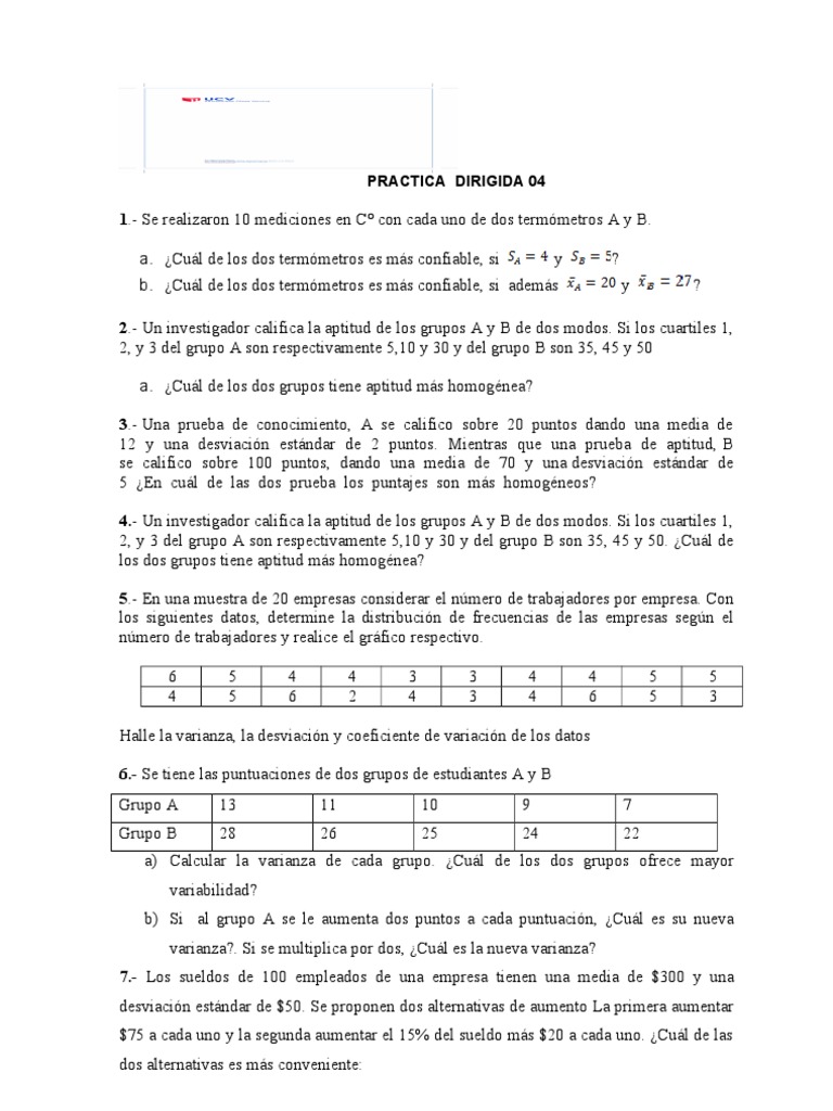 Halle la varianza, la desviacin y coeficiente de variacin de los datos 6.- Se tiene las puntuaciones de dos grupos de estudiantes A y B Grupo A Grupo B 13 28 11 26 10 25 9 24 7 22