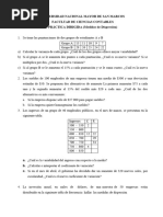 10.- En una empresa los sueldos fluctan entre 5000 y 20000 soles mensuales, con un promedio de 12000 soles y una desviacin estndar de 1200 soles. Se realizan tres propuestas de aumento: Primera Propuesta: 5% mas el sueldo y 1500 soles adicionales. Segunda Propuesta: 17.5% mas el sueldo Tercera Propuesta: 2100 soles para todos los trabajadores. a) Cul de las propuestas le conviene a la empresa? b) Cul de las propuestas le conviene a los trabajadores, si lo que se desea es disminuir la discrepancia entre el sueldo mnimo y el mximo? 11.- El sueldo promedio de 200 empleados de una empresa es 400 nuevos soles. Se propone dos alternativas de aumento: a) 75 soles a cada uno, b) 15% de su sueldo ms 10 soles a cada uno. Si la clnica dispone a lo mas de 94000 soles para pagar sueldos, Cul alternativa es la ms conveniente?