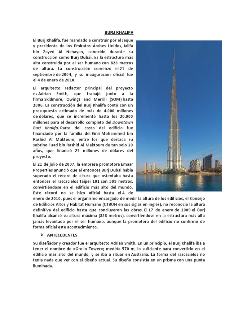 BURJ KHALIFA El Burj Khalifa, fue mandado a construir por el Jeque y presidente de los Emiratos rabes Unidos, Jalifa bin Zayed Al Nahayan, conocido durante su construccin como Burj Dubi. Es la estructura ms alta construida por el ser humano con 828 metros de altura. La construccin comenz el 21 de septiembre de 2004, y su inauguracin oficial fue el 4 de enero de 2010.