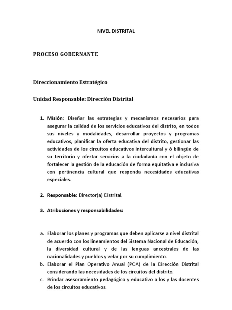 1. Misin: Disear las estrategias y mecanismos necesarios para asegurar la calidad de los servicios educativos del distrito, en todos sus niveles y modalidades, desarrollar proyectos y programas educativos, planificar la oferta educativa del distrito, gestionar las actividades de los circuitos educativos intercultural y bilinge de su territorio y ofertar servicios a la ciudadana con el objeto de fortalecer la gestin de la educacin de forma equitativa e inclusiva con pertinencia cultural que responda necesidades educativas especiales. 2. Responsable: Director(a) Distrital. 3. Atribuciones y responsabilidades: