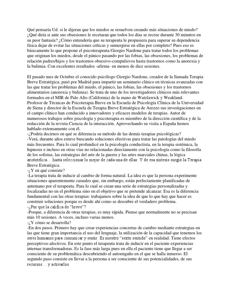 tomas un bombn a continuacin tienes que tomar 5, si es un bocadillo habrs de tomar otros 5 iguales. En tres meses haba perdido 12 kilos. Me dijo que alguna vez haba transgredido el rgimen pero que hacerlo 5 veces ms era una tortura. Se tom un bombn y dijo: Qu bien, ahora a tomarme los cinco restantes!. Pero, claro, el segundo le supo rico, el tercero menos, el cuarto an menos y el quinto le pareci ya insoportable. -Y para qu tipo de trastornos no es vlida su terapia? -No tratamos psicodependencias, drogas, alcoholismo, etc. Tambin est contraindicado en problemas que no presentan sintomatologa fuerte. Si se trata de pequeas crisis puntuales o problemas existenciales no se puede reutilizar la energa del propio trastorno y el paciente no sigue las prescripciones. Podramos decir que no est recomendada para casos sencillos sino para los muy graves. Recordemos que la terapia estratgica utiliza la energa y la fuerza del trastorno contra el trastorno mismo. Si el trastorno es dbil la energa tambin lo es. -Se tratan igual todos los trastornos? Se aplica el mismo protocolo a distintos pacientes? -La terapia ofrece estrategias especficas para problemas especficos. Existen protocolos para cada patologa, abiertos y adaptados a cada paciente. -Y con qu resultados? .Las estadsticas son muy buenas. Se resuelve el 88% de los casos en apenas 7 sesiones como media. Se ha tratado ya a 1.500 personas en Europa a las que se hizo un seguimiento durante seis meses comprobndose adems que no hay recadas ni desplazamiento de los sntomas. -Y en otros sitios? -En los ltimos aos han sido tratadas ms de 6.000 personas en todo el mundo con el mismo porcentaje de resultados. Hay un 88% de resultados positivos en los casos de agorafobia y de un 90% en los trastornos fbicos. El modelo es eficaz y cientfico. Y puede ser transmitido, se puede ensear a otros para que lo apliquen; de hecho, ya hay ms de 500 terapeutas formados en Italia y Europa. -Por qu cree Ud. que las psicoterapias rpidas son ms efectivas? -Las psicoterapias rpidas garantizan un modelo ms eficiente porque tienen una duracin limitada en el tiempo. Las largas, en cambio, al durar tantos aos fallan porque se producen cambios en la persona, en su vida y cuando acaba la terapia no puedes saber si realmente se ha curado la persona por la aplicacin de la terapia o por los cambios significativos que se han producido en su vida. -Funciona tanto para tratar miedos psicolgicos como fsicos? -Segn la Organizacin Mundial de la Salud (OMS) el ataque de pnico es la patologa que ms est creciendo en el mundo. Un alto nmero de personas lo ha padecido ya o lo padecen. Podra decirse incluso que hay dos trastornos que son producto de nuestro tiempo y de nuestra manera de vivir: la depresin y los ataques de pnico. Piense que el miedo es la emocin ms antigua y primordial del ser humano, tanto si es dirigido al interior como si va dirigido al exterior. Y al miedo tenemos que verlo desde dos vertientes: los aspectos sanos y los aspectos patolgicos. A fin de cuentas, es un mecanismo que nos pone alerta ante las amenazas y nos coloca en la mejor disposicin para resolver los problemas ya que activa el organismo para lograr una mejor reaccin. El miedo puede ayudarnos a salvar la vida. Sin embargo, se convierte en algo patolgico cuando supera un determinado umbral ya que entonces nos bloquea e incapacita para dar la respuesta adecuada y necesaria. Miedo a la prdida de un ser querido, a subir en un avin, a perder el control, a hablar en pblico, a sonrojarse, a perder el control de los esfnteres, a los espacios abiertos y a los reducidos, a la soledad, a determinados
