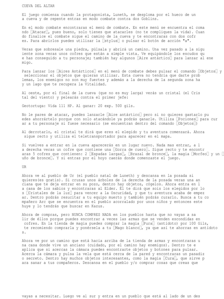 combate contra dos Goblins. En el modo combate encontraras el men de combate. En este men se encuentra el coma ndo Atacar , pues bueno, solo tienes que atacarles (no te compliques la vida). Cuan do finalice el combate sigue el camino de la cueva y te encontraras con dos cofr es. Para abrirlos puedes utilizar la stylus o pulsar el botn de accin "a". Veras que sobresale una piedra, plsala y abrir un camino. Una vez pasado a la sigu iente zona veras unos cofres que estn a simple vista. Ve equipndole los escudos qu e has conseguido a tu personaje; tambin hay algunos Aire antrtico para lanzar al ene migo. Para lanzar los Aires Antrticos en el men de combate debes pulsar el comando Objetos seleccionar el objetos que quieras utilizar. Esta cueva no tendra que darte prob lemas, los enemigos no son muy fuertes y adems a la derecha de la segunda zona ha y un lago que te recupera la Vitalidad. Al oeste, por el final de la cueva (que no es muy larga) vers un cristal (el Cris tal del viento) y pelears contra el primer jefe: Geotortuga: Vida 111 HP. Al ganar: 20 exp. 500 gils. No le pares de atacar, puedes lanzarle Aire antrtico pero si no quieres gastarlo pu edes ahorrrtelo porque con solo atacndole ya podrs ganarle. Utiliza Pociones para cur ar a tu personaje si fuese necesario (se encuentran dentro del comando Objetos ) Al derrotarlo, el cristal te dir que eres el elegido y tu aventura comenzar. Ahora sigue recto y utiliza el teletransportador para aparecer en el mapa. Si vuelves a entrar en la cueva aparecers en un lugar nuevo. Nada mas entrar, a l a derecha veras un cofre que contiene una Gorra de cuero . Sigue recto y te encontr aras 5 cofres que contienen: 2 Espadas largas , Brazal de bronce , la magia Morfeo uo de bronce . Y si entras por el hoyo caers donde comenzaste el juego. UR Ahora ve al pueblo de Ur (el pueblo natal de Luneth) y descansa en la posada si quieres(es gratis). Si cruzas unos rboles de la derecha de la posada veras una an ciana que te deja entrar en su pozo, dentro hay objetos, cgelos. Ahora entra en l a casa de los sabios y encontraras al Elder. l te dir que sois los elegidos por lo s Cristales de la luz para vencer a la Oscuridad, y que tu aventura acaba de empez ar. Dentro podrs resucitar a tu equipo muerto y tambin podrs curarlo. Busca a tu co mpaero Arc que se encuentra en el pueblo acorralado por unos nios y entonces este huye y lo tendrs que buscar en Kazus. Ahora de compras, pero NUNCA COMPRES NADA en los pueblos hasta que no vayas a sa lir de llos porque puedes encontrar a veces las armas que se venden escondidas en cofres. En la tienda de magia puedes comprar la magia Pura (antdoto) por 100 Gils, te recomiendo comprarla y ponrsela a tu Mago blanco , ya que as te ahorras en antdoto s. Ahora ve por un camino que est hacia arriba de la tienda de armas y encontraras u na casa donde vive un anciano (cuidado, por el camino hay enemigos). Dentro te e xplica que si acercas la cmara puedes encontrarte objetos y botones para pulsar. Acerca la cmara y pulsa la vela que est cerca de la pared y encontraras un pasadiz o secreto. Dentro hay muchos objetos interesantes, como la magia Cura , que sirve p ara sanar a tus compaeros. Descansa en el pueblo y/o comprar cosas que creas que y