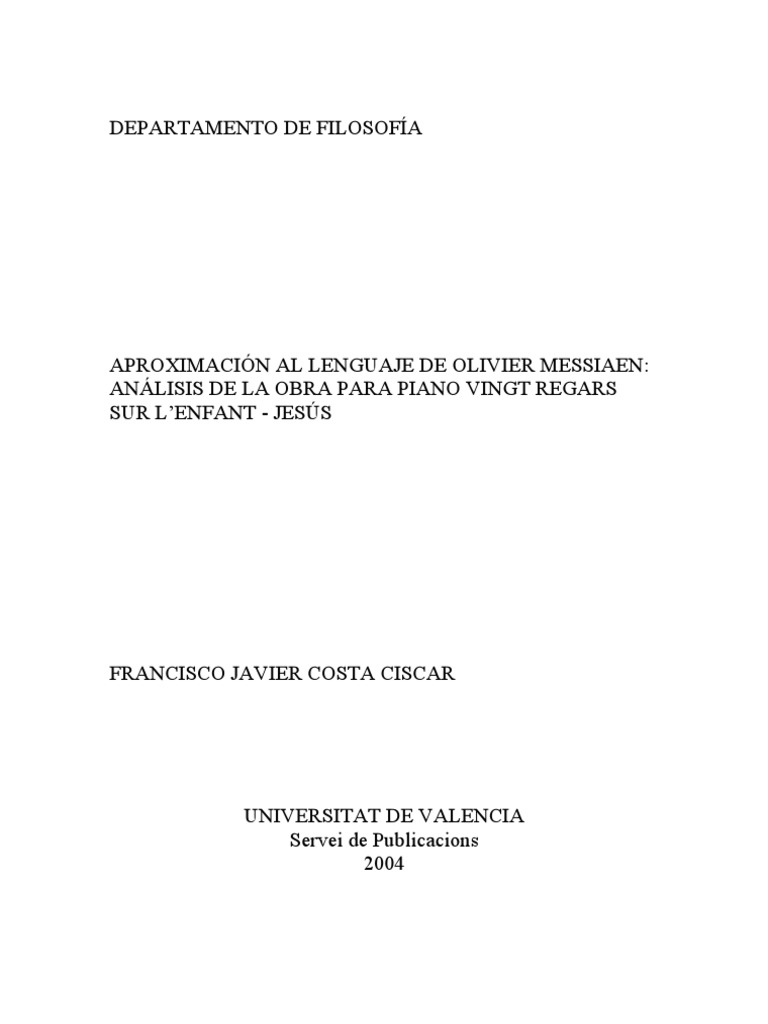 de este estudio es una aproximacin al lenguaje de Olivier partir del anlisis de su obra para piano Vingt Regards sur l Enfant-Jsus. Obra de gran envergadura, -ms de dos horas de duracincompuesta desde el 23 de Marzo al 8 de Septiembre de 1944, el mismo ao que escribe su tratado terico Technique de mon langage musical, compuesta un ao ms tarde que Visions de lAmen, para dos pianos, y cuatro aos antes que Cantyodjaya (1948): obra pianstica que marcar el inicio de una nueva etapa mucho ms especulativa en la produccin del compositor. Escritura pianstica por excelencia, msica pensada por y para el piano, en 20 piezas, forma un corpus unitario y homogneo, en cuanto a estilo (encontramos los recursos habituales del lenguaje de Messiaen de esta poca) y en cuanto a la intencin o temtica que es profundamente religiosa, y que como indica Messiaen se trata en realidad de la