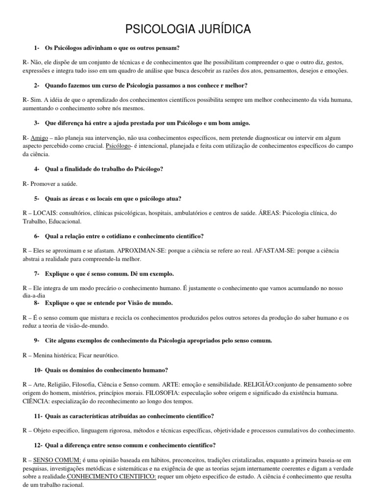 1- Os Psiclogos adivinham o que os outros pensam? R- No, ele dispe de um conjunto de tcnicas e de conhecimentos que lhe possibilitam compreender o que o outro diz, gestos, expresses e integra tudo isso em um quadro de anlise que busca descobrir as razes dos atos, pensamentos, desejos e emoes. 2- Quando fazemos um curso de Psicologia passamos a nos conhece r melhor? R- Sim. A idia de que o aprendizado dos conhecimentos cientficos possibilita sempre um melhor conhecimento da vida humana, aumentando o conhecimento sobre ns mesmos. 3- Que diferena h entre a ajuda prestada por um Psiclogo e um bom amigo. R- Amigo no planeja sua interveno, no usa conhecimentos especficos, nem pretende diagnosticar ou intervir em algum aspecto percebido como crucial. Psiclogo- intencional, planejada e feita com utilizao de conhecimentos especficos do campo da cincia. 4- Qual a finalidade do trabalho do Psiclogo? R- Promover a sade. 5- Quais as reas e os locais em que o psiclogo atua? R LOCAIS: consultrios, clnicas psicolgicas, hospitais, ambulatrios e centros de sade. REAS: Psicologia clnica, do Trabalho, Educacional. 6- Qual a relao entre o cotidiano e conhecimento cientifico? R Eles se aproximam e se afastam. APROXIMAN-SE: porque a cincia se refere ao real. AFASTAM-SE: porque a cincia abstrai a realidade para compreende-la melhor. 7- Explique o que senso comum. D um exemplo. R Ele integra de um modo precrio o conhecimento humano. justamente o conhecimento que vamos acumulando no nosso dia-a-dia 8- Explique o que se entende por Viso de mundo. R o senso comum que mistura e recicla os conhecimentos produzidos pelos outros setores da produo do saber humano e os reduz a teoria de viso-de-mundo. 9- Cite alguns exemplos de conhecimento da Psicologia apropriados pelo senso comum. R Menina histrica; Ficar neurtico. 10- Quais os domnios do conhecimento humano? R Arte, Religio, Filosofia, Cincia e Senso comum. ARTE: emoo e sensibilidade. RELIGIO:conjunto de pensamento sobre origem do homem, mistrios, princpios morais. FILOSOFIA: especulao sobre origem e significado da existncia humana. CINCIA: especializao do reconhecimento ao longo dos tempos. 11- Quais as caractersticas atribudas ao conhecimento cientifico? R Objeto especifico, linguagem rigorosa, mtodos e tcnicas especficas, objetividade e processos cumulativos do conhecimento. 12- Qual a diferena entre senso comum e conhecimento cientifico? R SENSO COMUM: uma opinio baseada em hbitos, preconceitos, tradies cristalizadas, enquanto a primeira baseia-se em pesquisas, investigaes metdicas e sistemticas e na exigncia de que as teorias sejam internamente coerentes e digam a verdade sobre a realidade.CONHECIMENTO CIENTIFICO: requer um objeto especifico de estudo. A cincia conhecimento que resulta de um trabalho racional.