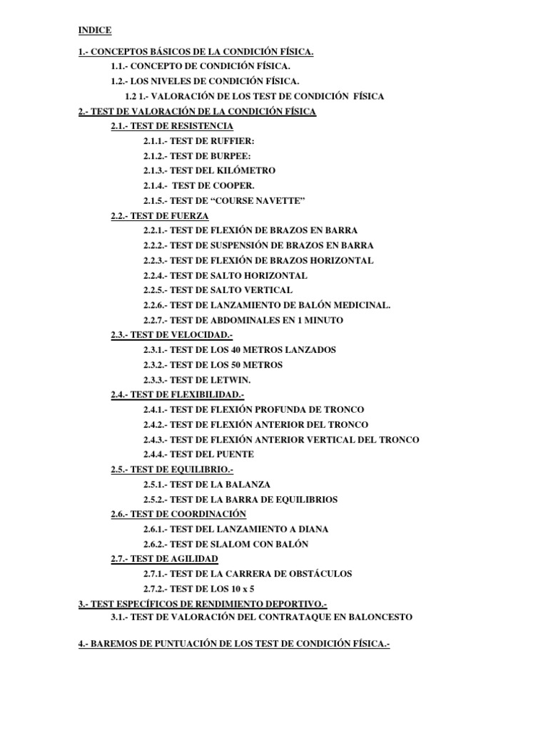 1.2 1.- VALORACIN DE LOS TEST DE CONDICIN FSICA 2.- TEST DE VALORACIN DE LA CONDICIN FSICA 2.1.- TEST DE RESISTENCIA 2.1.1.- TEST DE RUFFIER: 2.1.2.- TEST DE BURPEE: 2.1.3.- TEST DEL KILMETRO 2.1.4.- TEST DE COOPER. 2.1.5.- TEST DE COURSE NAVETTE 2.2.- TEST DE FUERZA 2.2.1.- TEST DE FLEXIN DE BRAZOS EN BARRA 2.2.2.- TEST DE SUSPENSIN DE BRAZOS EN BARRA 2.2.3.- TEST DE FLEXIN DE BRAZOS HORIZONTAL 2.2.4.- TEST DE SALTO HORIZONTAL 2.2.5.- TEST DE SALTO VERTICAL 2.2.6.- TEST DE LANZAMIENTO DE BALN MEDICINAL. 2.2.7.- TEST DE ABDOMINALES EN 1 MINUTO 2.3.- TEST DE VELOCIDAD.2.3.1.- TEST DE LOS 40 METROS LANZADOS 2.3.2.- TEST DE LOS 50 METROS 2.3.3.- TEST DE LETWIN. 2.4.- TEST DE FLEXIBILIDAD.2.4.1.- TEST DE FLEXIN PROFUNDA DE TRONCO 2.4.2.- TEST DE FLEXIN ANTERIOR DEL TRONCO 2.4.3.- TEST DE FLEXIN ANTERIOR VERTICAL DEL TRONCO 2.4.4.- TEST DEL PUENTE 2.5.- TEST DE EQUILIBRIO.2.5.1.- TEST DE LA BALANZA 2.5.2.- TEST DE LA BARRA DE EQUILIBRIOS 2.6.- TEST DE COORDINACIN 2.6.1.- TEST DEL LANZAMIENTO A DIANA 2.6.2.- TEST DE SLALOM CON BALN 2.7.- TEST DE AGILIDAD 2.7.1.- TEST DE LA CARRERA DE OBSTCULOS 2.7.2.- TEST DE LOS 10 x 5 3.- TEST ESPECFICOS DE RENDIMIENTO DEPORTIVO.3.1.- TEST DE VALORACIN DEL CONTRATAQUE EN BALONCESTO 4.- BAREMOS DE PUNTUACIN DE LOS TEST DE CONDICIN FSICA.-
