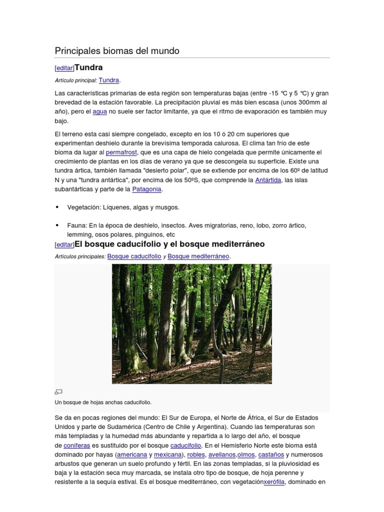 Sur. El agua fra baja la temperatura del aire y son lugares en donde el aire desciende y no sopla hacia tierra. En el mar sern frecuentes las nieblas, pero en la tierra cercana no llover. Desierto: Situacin y clima. En zonas con precipitaciones muy escasas y temperaturas con grandes variaciones entre da y noche. Vegetacin. Escasa y adaptada a la escasez de agua. Destacan los cactos (Amrica), y las palmeras , las chumberas y tambin aloe (frica y Asia). Fauna. Coyote, puma, serpiente de cascabel (Amrica); dromedario, rata del desierto, cobra (frica); etc. [editar]Vegetacin La vegetacin se encuentra muy espaciada y las plantas suelen tener mecanismos repelentes para asegurar que en su cercana no se sitan otros ejemplares. Hay cuatro formas principales de vida vegetal adaptadas al desierto: 1. Plantas que sincronizan sus ciclos de vida, con los periodos de lluvia y crecen slo cuando hay humedad. Cuando llueve con intensidad suficiente, sus semillas germinan y con gran rapidez crecen las plantas y forman vistosas flores. Los insectos son atrados por las flores y las polinizan al viajar de unas a otras. Muchos de estos insectos poseen tambin unos ciclos vitales muy cortos, adaptados a los de las plantas de las que se alimentan. 2. Matorrales de largas races que penetran en el suelo hasta llegar a la humedad. Se desarrollan especialmente en desiertos fros. Sus hojas se suelen caer antes que la planta se marchite totalmente y de esta forma pasa a un estado de vida latente, hasta que vuelva a haber humedad en el subsuelo. 3. Plantas que acumulan agua en sus tejidos. Son de formas suculentas, como los cactus o las euforbias y tienen paredes gruesas, pas y espinas para protegerse de los fitfagos. Su rigidez es otra forma de protegerse contra la desecacin producida por el viento. 4. Microflora, que permanece latente hasta que se producen buenas condiciones para su desarrollo. [editar]Vida animal y humana La vida animal tambin ha desarrollado adaptaciones muy especficas para sobrevivir en un medio tan seco. Las excreciones de los animales que viven en el desierto contienen muy poca agua y muchos son capaces de obtener agua de los alimentos. Son de hbitos de vida nocturnos y durante el da permanecen en cuevas y madrigueras bajo tierra. El hombre ha desarrollado culturas que, con mucho ingenio, le han permitido vivir en los lmites de los desiertos o en las mismas zonas desrticas. Cuando el terreno desrtico se riega, en los lugares en los que los suelos son adecuados, puede convertirse en uno de los sistemas agrcolas ms productivos. Pero la puesta en cultivo de los terrenos ridos suele traer problemas de agotamiento de las fuentes de agua y salinizacin, como sucedi en las antiguas culturas mesopotmicas, si no se aplican sistemas para evitar esta dificultad. Para su explotacin hay que conocer bien como funciona el ecosistema y actuar en consecuencia. [editar]Taiga