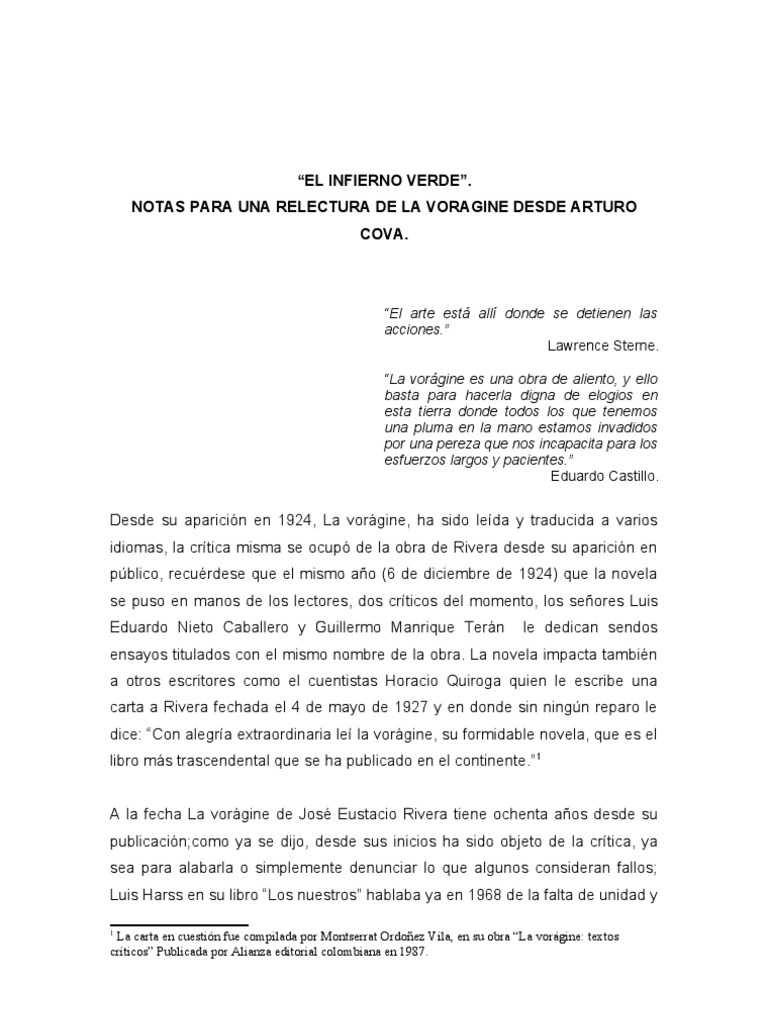 El arte est all donde se detienen las acciones. Lawrence Sterne. La vorgine es una obra de aliento, y ello basta para hacerla digna de elogios en esta tierra donde todos los que tenemos una pluma en la mano estamos invadidos por una pereza que nos incapacita para los esfuerzos largos y pacientes. Eduardo Castillo.