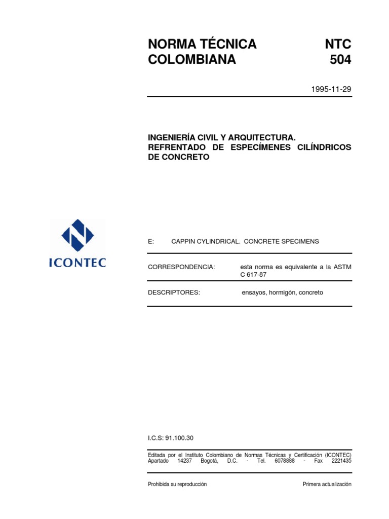 El Instituto Colombiano de Normas Tcnicas y Certificacin, ICONTEC, es el organismo nacional de normalizacin, segn el Decreto 2269 de 1993. ICONTEC es una entidad de carcter privado, sin nimo de lucro, cuya Misin es fundamental para brindar soporte y desarrollo al productor y proteccin al consumidor. Colabora con el sector gubernamental y apoya al sector privado del pas, para lograr ventajas competitivas en los mercados interno y externo. La representacin de todos los sectores involucrados en el proceso de Normalizacin Tcnica est garantizada por los Comits Tcnicos y el perodo de Consulta Pblica, este ltimo caracterizado por la participacin del pblico en general. La NTC 504 (Primera actualizacin) fue ratificada por el Consejo Directivo de 1995-11-29 Esta norma est sujeta a ser actualizada permanentemente con el objeto de que responda en todo momento a las necesidades y exigencias actuales. A continuacin se relacionan las empresas que colaboraron en el estudio de esta norma a travs de su participacin en el Comit Tcnico 369901 Concreto, Morteros y Agregados de la STN ICONTEC-ASOCRETO SUPERINTENDENCIA DE INDUSTRIA Y COMERCIO ASOCIACIN COLOMBIANA DE PRODUCTORES DE CONCRETO ASOCRETO ASOCIACIN DE PRODUCTORES DE AGREGADOS PTREOS DE LA SABANA DE BOGOT CONCRETOS PREMEZCLADOS S.A. CONCONCRETO S.A. CEMENTOS BOYAC S.A. COMPAA DE CEMENTOS ARGOS S.A. INSTITUTO COLOMBIANO DE PRODUCTORES DE CEMENTO SIKA ANDINA S.A. TOXEMENT S.A. UNIVERSIDAD NACIONAL DE COLOMBIA