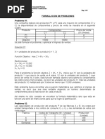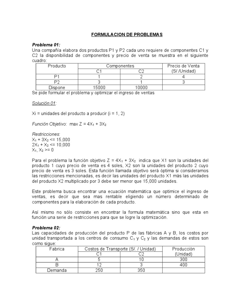 FORMULACION DE PROBLEMAS Problema 01: Una compaa elabora dos productos P1 y P2 cada uno requiere de componentes C1 y C2 la disponibilidad de componentes