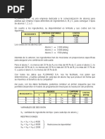 x2 = la Cantidad a comprar de QUESO x3 = la Cantidad a comprar de HUEVO x4 = la Cantidad a comprar de CARNE Min W = 40x1 + 31x2 + 19x3 + 53x4.(1) Sujeto a: 0.20x1 + 0.15x2 + 0.15x3 + 0.30x4 > 4 0.18x1 + 0.10x2 + 0.40x3 + 0.35x4 > 6 0.10x1 + 0.14x2 + 0.15x3 + 0.16x4 > 3 x1, x2, x3, x4 > 0 Problema 32: (Inversiones) A Julio que es asesor de inversiones, se le presentan 4 proyectos con sus respectivos costos en un perodo de tres aos, as como la utilidad total. El requiere maximizar la utilidad total disponiendo de $50,000; $24,000; y $30,000 en cada uno de los aos siguientes: PROYECTO UTILIDAD COSTO COSTO COSTO TOTAL AO 1 AO 2 AO 3 X1 100 6 14 5 X2 90 2 8 14 X3 75 9 19 18 X4 80 5 2 9 Solucin: Qu es lo que vamos a Minimizar? x1 = la Cantidad de Maz Libra por libra de Alimento x2 = la Cantidad de Harina de Soya Libra por libra de Alimento Min Z = 0.2x1 + 0.6x2 .(1) Sujeto a: 0.001x1 + 0.002x2 < (90)(0.01) .. (2) 0.09x1 + 0.6x2 < (90)(0.3) .(3) 0.02x1 + 0.06x2 > (90)(0.05) .......... (4) lo que queda Planteado x1, x2 > 0 Disponibilidad: Las cantidades disponibles por ao se asignan a las diferentes variables o proyectos bajo estas restricciones para optimizar o maximizar la utilidad total. Problema 33: Supngase que el Banco de Crdito al Campesino tiene dos planes de inversin a saber: El primero en el programa de tierras de riego, el segundo en el programa de tierras de temporal. El primer programa regresa un 30% de la inversin al fin del ao,