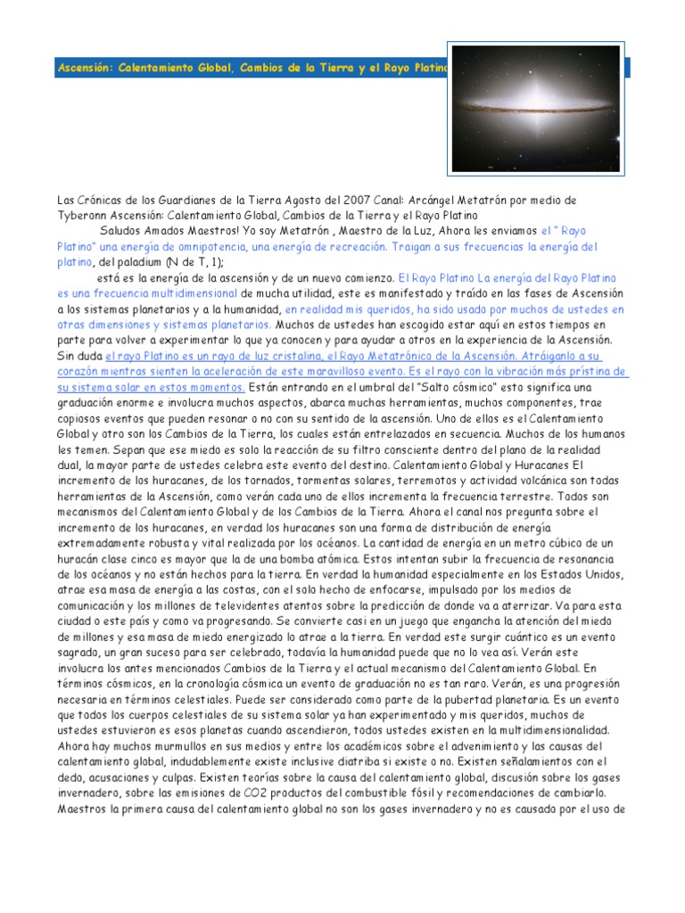 Las Crnicas de los Guardianes de la Tierra Agosto del 2007 Canal: Arcngel Metatrn por medio de Tyberonn Ascensin: Calentamiento Global, Cambios de la Tierra y el Rayo Platino Saludos Amados Maestros! Yo soy Metatrn , Maestro de la Luz, Ahora les enviamos el Rayo Platino una energa de omnipotencia, una energa de recreacin. Traigan a sus frecuencias la energa del platino, del paladium (N de T, 1); est es la energa de la ascensin y de un nuevo comienzo. El Rayo Platino La energa del Rayo Platino es una frecuencia multidimensional de mucha utilidad, este es manifestado y trado en las fases de Ascensin a los sistemas planetarios y a la humanidad, en realidad mis queridos, ha sido usado por muchos de ustedes en otras dimensiones y sistemas planetarios. Muchos de ustedes han escogido estar aqu en estos tiempos en parte para volver a experimentar lo que ya conocen y para ayudar a otros en la experiencia de la Ascensin. Sin duda el rayo Platino es un rayo de luz cristalina, el Rayo Metatrnico de la Ascensin. Atriganlo a su corazn mientras sienten la aceleracin de este maravilloso evento. Es el rayo con la vibracin ms prstina de su sistema solar en estos momentos. Estn entrando en el umbral del Salto csmico esto significa una graduacin enorme e involucra muchos aspectos, abarca muchas herramientas, muchos componentes, trae copiosos eventos que pueden resonar o no con su sentido de la ascensin. Uno de ellos es el Calentamiento Global y otro son los Cambios de la Tierra, los cuales estn entrelazados en secuencia. Muchos de los humanos les temen. Sepan que ese miedo es solo la reaccin de su filtro consciente dentro del plano de la realidad dual, la mayor parte de ustedes celebra este evento del destino. Calentamiento Global y Huracanes El incremento de los huracanes, de los tornados, tormentas solares, terremotos y actividad volcnica son todas herramientas de la Ascensin, como vern cada uno de ellos incrementa la frecuencia terrestre. Todos son mecanismos del Calentamiento Global y de los Cambios de la Tierra. Ahora el canal nos pregunta sobre el incremento de los huracanes, en verdad los huracanes son una forma de distribucin de energa extremadamente robusta y vital realizada por los ocanos. La cantidad de energa en un metro cbico de un huracn clase cinco es mayor que la de una bomba atmica. Estos intentan subir la frecuencia de resonancia de los ocanos y no estn hechos para la tierra. En verdad la humanidad especialmente en los Estados Unidos, atrae esa masa de energa a las costas, con el solo hecho de enfocarse, impulsado por los medios de comunicacin y los millones de televidentes atentos sobre la prediccin de donde va a aterrizar. Va para esta ciudad o este pas y como va progresando. Se convierte casi en un juego que engancha la atencin del miedo de millones y esa masa de miedo energizado lo atrae a la tierra. En verdad este surgir cuntico es un evento sagrado, un gran suceso para ser celebrado, todava la humanidad puede que no lo vea as. Vern este involucra los antes mencionados Cambios de la Tierra y el actual mecanismo del Calentamiento Global. En trminos csmicos, en la cronologa csmica un evento de graduacin no es tan raro. Vern, es una progresin necesaria en trminos celestiales. Puede ser considerado como parte de la pubertad planetaria. Es un evento que todos los cuerpos celestiales de su sistema solar ya han experimentado y mis queridos, muchos de ustedes estuvieron es esos planetas cuando ascendieron, todos ustedes existen en la multidimensionalidad. Ahora hay muchos murmullos en sus medios y entre los acadmicos sobre el advenimiento y las causas del calentamiento global, indudablemente existe inclusive diatriba si existe o no. Existen sealamientos con el dedo, acusaciones y culpas. Existen teoras sobre la causa del calentamiento global, discusin sobre los gases invernadero, sobre las emisiones de CO2 productos del combustible fsil y recomendaciones de cambiarlo. Maestros la primera causa del calentamiento global no son los gases invernadero y no es causado por el uso de