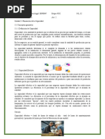 cambian de aeronave (debidamente repintada) cuando las rutas de una de ellas se utilizan con mucha frecuencia y las de la otra no. Las aerolneas que comparten rutas constituyen un nuevo enfoque al emplear el mismo nmero de vuelo aun cuando la compaa de la aerolnea puede cambiar durante la ruta. En el captulo 9 se estudi con detalle el tema de subcontratacin, o conocido tambin con el trmino en ingls "outsourcing". DETERMINACIN DE LOS REQUERIMIENTOS DE CAPACIDAD Para determinar los requerimientos de capacidad es necesario tomar en cuenta las demandas de las lneas de los productos, las capacidades de cada planta y la asignacin de la produccin en la red de la planta. Esto se lleva a cabo mediante los siguientes pasos: 1.- Aplicacin de tcnicas de proyeccin (vase el captulo 12) para predecir las ventas de productos individuales de cada lnea de producto. 2.- Clculo de las necesidades de equipo y mano de obra para cumplir con las proyecciones en las lneas de productos. 3.- Proyeccin de la disponibilidad de equipo y mano de obra en el horizonte de planeacin. Con frecuencia la empresa decide mantener un excedente de capacidad entre los requerimientos que se proyectan y la capacidad real. Un excedente de la capacidad es una cantidad de capacidad superior a la demanda esperada. Por ejemplo, si la demanda anual esperada de unas instalaciones es de $10 millones en productos por ao y la capacidad diseada es de $12 millones anuales, entonces el excedente de capacidad es de 20 por ciento. Un excedente de capacidad de 20 por ciento corresponde a una tasa de utilizacin de 83 por ciento (100%/120%). Cuando la capacidad diseada de una compaa es menor que la capacidad que se necesita para satisfacer la demanda, se dice que la compaa tiene un excedente de capacidad negativo. Por ejemplo, si una empresa tiene una demanda de 12 millones de pesos en productos por ao, pero slo puede producir 10 millones de pesos anuales, tiene un excedente de capacidad negativo de 16.7 por ciento. Ahora aplicaremos estos tres pasos en el siguiente ejemplo. EJEMPLO 10.1: Determinacin de los requerimientos de capacidad