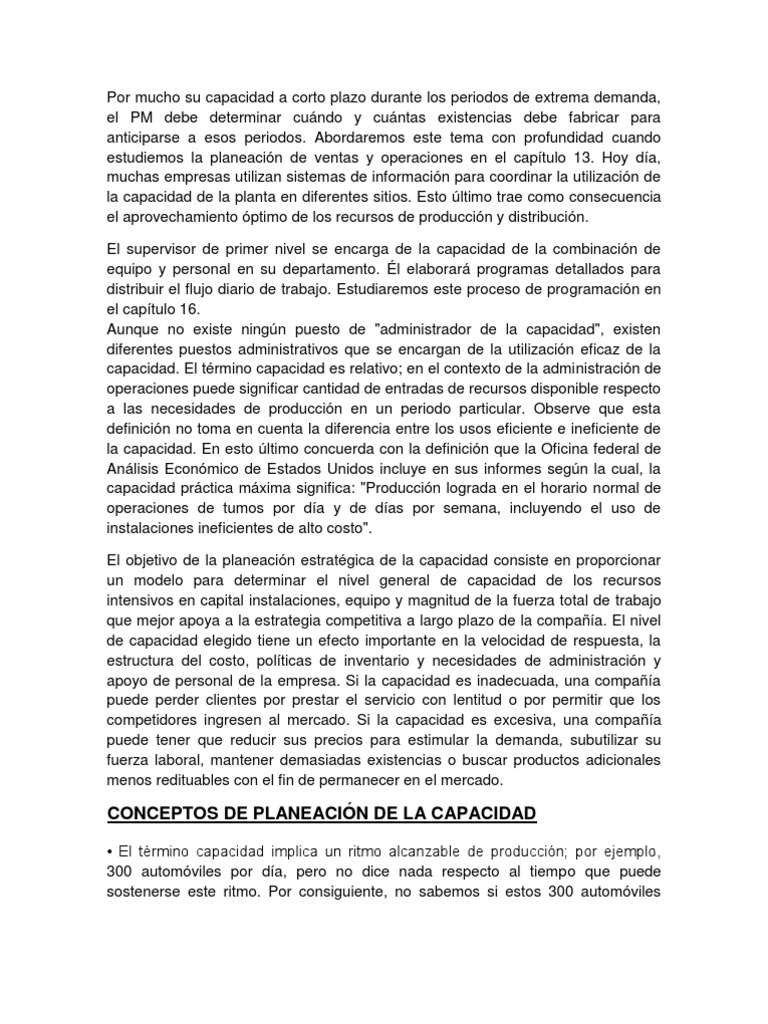 debe fabricar para anticiparse a esos periodos. Abordaremos este tema con profundidad cuando estudiemos la planeacin de ventas y operaciones en el captulo 13. Hoy da, muchas empresas utilizan sistemas de informacin para coordinar la utilizacin de la capacidad de la planta en diferentes sitios. Esto ltimo trae como consecuencia el aprovechamiento ptimo de los recursos de produccin y distribucin. El supervisor de primer nivel se encarga de la capacidad de la combinacin de equipo y personal en su departamento. l elaborar programas detallados para distribuir el flujo diario de trabajo. Estudiaremos este proceso de programacin en el captulo 16. Aunque no existe ningn puesto de "administrador de la capacidad", existen diferentes puestos administrativos que se encargan de la utilizacin eficaz de la capacidad. El trmino capacidad es relativo; en el contexto de la administracin de operaciones puede significar cantidad de entradas de recursos disponible respecto a las necesidades de produccin en un periodo particular. Observe que esta definicin no toma en cuenta la diferencia entre los usos eficiente e ineficiente de la capacidad. En esto ltimo concuerda con la definicin que la Oficina federal de Anlisis Econmico de Estados Unidos incluye en sus informes segn la cual, la capacidad prctica mxima significa: "Produccin lograda en el horario normal de operaciones de tumos por da y de das por semana, incluyendo el uso de instalaciones ineficientes de alto costo". El objetivo de la planeacin estratgica de la capacidad consiste en proporcionar un modelo para determinar el nivel general de capacidad de los recursos intensivos en capital instalaciones, equipo y magnitud de la fuerza total de trabajo que mejor apoya a la estrategia competitiva a largo plazo de la compaa. El nivel de capacidad elegido tiene un efecto importante en la velocidad de respuesta, la estructura del costo, polticas de inventario y necesidades de administracin y apoyo de personal de la empresa. Si la capacidad es inadecuada, una compaa puede perder clientes por prestar el servicio con lentitud o por permitir que los competidores ingresen al mercado. Si la capacidad es excesiva, una compaa puede tener que reducir sus precios para estimular la demanda, subutilizar su fuerza laboral, mantener demasiadas existencias o buscar productos adicionales menos redituables con el fin de permanecer en el mercado.
