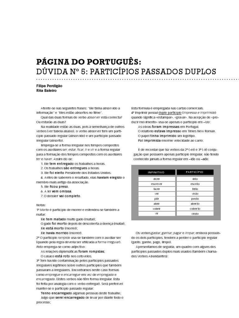 Atente-se nas seguintes frases: Ele tinha absorvido a informao e Eles esto absortos no lme. Qual das duas formas do verbo absorver est correcta? Ou estaro as duas? Na realidade esto as duas, pois semelhana de outros verbos (ver tabela abaixo), o verbo absorver tem um particpio passado regular (absorvido) e um particpio passado irregular (absorto). Emprega-se a forma irregular nos tempos compostos com os auxiliares ser, estar, car, ir e vir e a forma regular para a formao dos tempos compostos com os auxiliares ter e haver. Assim diz-se: 1. Ele tem entregado os trabalhos a horas. 2. Os trabalhos so entregues a horas. 3. Ele foi eleito Presidente dos Estados Unidos. 4. Antes de saberem o resultado, elas haviam elegido o membro mais antigo da associao. 5. Ele cou preso. 6. A lei vem omissa. 7. O dossier vai completo. Notas: 1 Morto particpio de morrer e estendeu-se tambm a matar: Ele tem matado muito gado (matar); O gado foi morto depois de descoberta a doena (matar); Ele est morto (morrer); Ele havia morrido (morrer). 2 O particpio rompido usa-se tambm com o auxiliar ser (quando pela regra deveria ser utilizada a forma irregular ). Roto emprega-se como adjectivo: As relaes diplomticas foram rompidas; O casaco est roto nos cotovelos. 3 Tem havido contaminao pelos particpios passados irregulares legtimos sobre outros particpios que tambm passaram a irregulares. Encontramos neste caso formas como empregue e encarregue em vez de empregado e encarregado. (Estes verbos no tm forma irregular. Esta foi feita por analogia com o verbo entregar). Ser prefervel manter-se o particpio passado regular: Tenho encarregado algumas pessoas deste trabalho; Julgo que serei encarregado de levar por diante todo o processo;