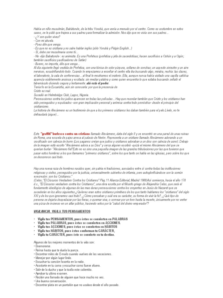 Este "graffiti" burlesco contra un cristiano llamado Alexmeno, data del siglo II y se encontr en una pared de unas ruinas de Roma, una escuela de pajes anexa al palacio de Nern. Representa a un cristiano llamado Alexmeno adorando a un crucificado con cabeza de burro (Los paganos crean que judos y cristianos adoraban a un dios con cabeza de asno). Debajo de la imagen est escrito "Alexmeno adora a su Dios" y cerca alguien escribi -quiz el mismo Alexmeno del que se queran burlar- "Alexmeno fiel"Esto no es sino una pequea imagen de las grandes tribulaciones por las que tuvieron que pasar estos hombres a los que llamamos "primeros cristianos", sobre los que tanto se habla en las iglesias, pero sobre los que se desconoce casi todo. Hay una nueva raza de hombres nacidos ayer, sin patria ni tradiciones, asociados entre s contra todas las instituciones religiosas y civiles, perseguidos por la justicia, universalmente cubiertos de infamia, pero autoglorificndose con la comn execrecin: son los Cristianos." (Celso; "El Discurso Verdadero Contra los Cristianos" Pg.11 Alianza Editorial; Madrid 1988)As comienza, hacia el ao 178 d.c., "El Discurso verdadero contra los Cristianos", una obra escrita por el filsofo griego de Alejandra Celso, que ser el fundamento ideolgico de algunas de las mas duras persecuciones contra los creyentes en Jess de Nazaret que se sucedern en los aos siguientes.Quines eran estos cristianos primitivos de los que tanto hablamos los "cristianos" del siglo XXI y de los que ignoramos casi todo?, Cmo pensaban y cul era su carcter, su forma de vivir la fe?, Qu tipo de persona se dejara despedazar por las fieras, o quemar viva, o cornear por un toro hasta la muerte, nicamente por no verter una pizca de incienso en un altar pblico, haciendo votos por la "salud del divino emperador"? VIGILANCIA. VIGILA TUS PENSAMIENTOS Vigila tus PENSAMIENTOS, pues stos se convierten en PALABRAS Vigila tus PALABRAS, pues stas se convierten en ACCIONES. Vigila tus ACCIONES, pues stas se convierten en HBITOS Vigila tus HBITOS, pues stos conforman tu CARCTER, Vigila tu CARCTER, pues ste se convierte en tu destino.