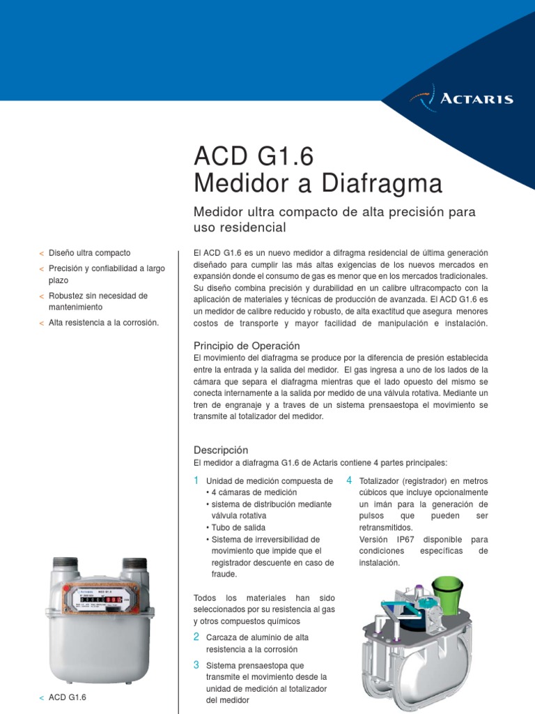 < Diseo ultra compacto < Precisin y confiabilidad a largo plazo < Robustez sin necesidad de mantenimiento < Alta resistencia a la corrosin. El ACD G1.6 es un nuevo medidor a difragma residencial de ltima generacin diseado para cumplir las ms altas exigencias de los nuevos mercados en expansin donde el consumo de gas es menor que en los mercados tradicionales. Su diseo combina precisin y durabilidad en un calibre ultracompacto con la aplicacin de materiales y tcnicas de produccin de avanzada. El ACD G1.6 es un medidor de calibre reducido y robusto, de alta exactitud que asegura menores costos de transporte y mayor facilidad de manipulacin e instalacin.