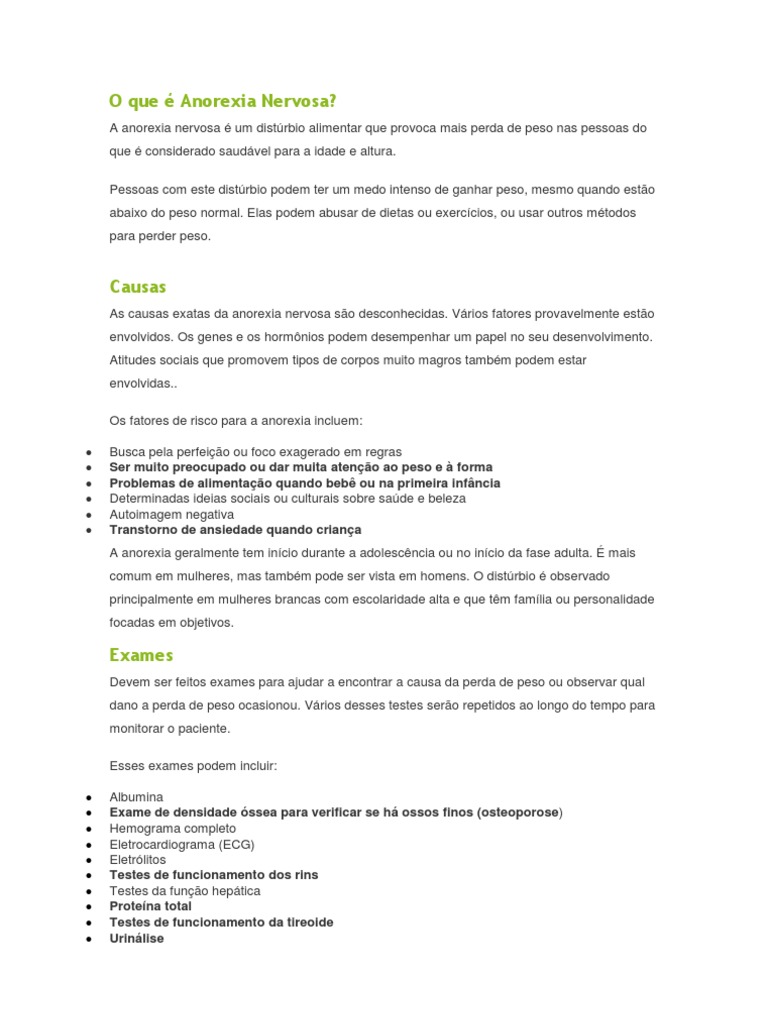 Para ser diagnosticada com anorexia, uma pessoa deve: Ter medo enorme de ganhar peso ou ficar gorda, mesmo quando estiver abaixo do peso normal Recusar-se a manter o peso no que considerado normal ou aceitvel para sua idade e altura (15% ou mais abaixo do peso normal) Ter uma imagem corporal muito distorcida, ser muito focada no peso ou na forma corporal e se recusar a admitir a gravidade da perda de peso No ter menstruado por trs ou mais ciclos (em mulheres) As pessoas com anorexia podem limitar gravemente a quantidade de comida que ingerem e depois provocar vmitos. Outros comportamentos incluem: Cortar a comida em pequenos pedaos ou movlos no prato em vez de comlos Exercitar-se o tempo todo, mesmo quando o tempo estiver ruim, quando estiver machucada ou ocupada Ir ao banheiro imediatamente aps as refeies Recusar-se a comer perto de outras pessoas Usar comprimidos para urinar (diurticos), evacuar (enemas e laxantes) ou reduzir o apetite (comprimidos para perda de peso) Outros sintomas de anorexia podem incluir: Pele manchada ou amarelada, seca e coberta por pelos finos Pensamento confuso ou lento, junto com memria ou julgamento deficientes Depresso Boca seca Extrema sensibilidade ao frio (vestir vrias camadas de roupas para ficar aquecido) Perda de resistncia ssea Desgaste dos msculos e perda de gordura corporal