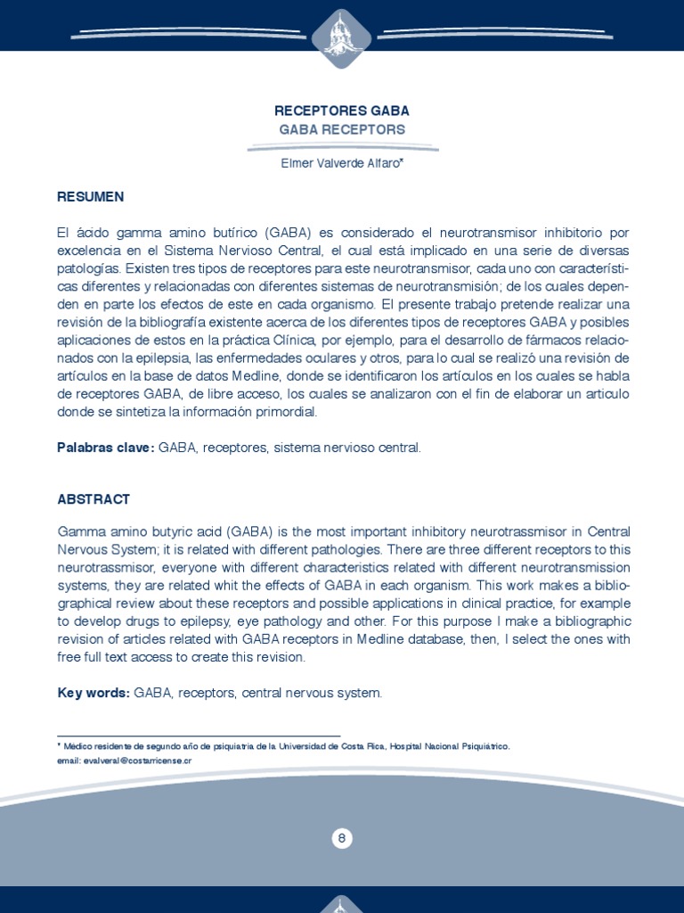RESUMEN El cido gamma amino butrico (GABA) es considerado el neurotransmisor inhibitorio por excelencia en el Sistema Nervioso Central, el cual est implicado en una serie de diversas patologas. Existen tres tipos de receptores para este neurotransmisor, cada uno con caractersticas diferentes y relacionadas con diferentes sistemas de neurotransmisin; de los cuales dependen en parte los efectos de este en cada organismo. El presente trabajo pretende realizar una revisin de la bibliografa existente acerca de los diferentes tipos de receptores GABA y posibles aplicaciones de estos en la prctica Clnica, por ejemplo, para el desarrollo de frmacos relacionados con la epilepsia, las enfermedades oculares y otros, para lo cual se realiz una revisin de artculos en la base de datos Medline, donde se identificaron los artculos en los cuales se habla de receptores GABA, de libre acceso, los cuales se analizaron con el fin de elaborar un articulo donde se sintetiza la informacin primordial. Palabras clave: GABA, receptores, sistema nervioso central. ABSTRACT Gamma amino butyric acid (GABA) is the most important inhibitory neurotrassmisor in Central Nervous System; it is related with different pathologies. There are three different receptors to this neurotrassmisor, everyone with different characteristics related with different neurotransmission systems, they are related whit the effects of GABA in each organism. This work makes a bibliographical review about these receptors and possible applications in clinical practice, for example to develop drugs to epilepsy, eye pathology and other. For this purpose I make a bibliographic revision of articles related with GABA receptors in Medline database, then, I select the ones with free full text access to create this revision. Key words: GABA, receptors, central nervous system.