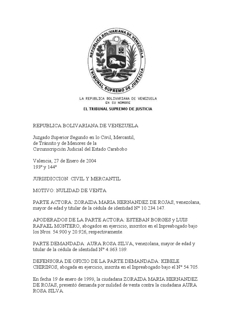 Valencia, 27 de Enero de 2004 193 y 144 JURISDICCION: CIVIL Y MERCANTIL MOTIVO: NULIDAD DE VENTA PARTE ACTORA: ZORAIDA MARIA HERNANDEZ DE ROJAS, venezolana, mayor de edad y titular de la cdula de identidad N 10.234.147. APODERADOS DE LA PARTE ACTORA: ESTEBAN BORGES y LUIS RAFAEL MONTERO, abogados en ejercicio, inscritos en el Inpreabogado bajo los Nros. 54.900 y 20.926, respectivamente. PARTE DEMANDADA: AURA ROSA SILVA, venezolana, mayor de edad y titular de la cdula de identidad N 4.863.189. DEFENSORA DE OFICIO DE LA PARTE DEMANDADA: KIBELE CHIRINOS, abogada en ejercicio, inscrita en el Inpreabogado bajo el N 54.705. En fecha 19 de enero de 1998, la ciudadana ZORAIDA MARIA HERNANDEZ DE ROJAS, present demanda por nulidad de venta contra la ciudadana AURA ROSA SILVA.