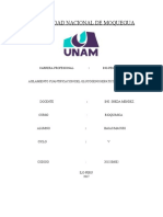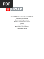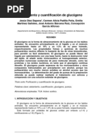 El glucgeno es el principal polisacrido de reserva de las clulas animales al igual que la amilipectina es un polisacrido ramificado de la D-glucosa con enlaces alfa-1,4 yalfa1,[Link] glucgeno es abundante en el hgado, puede alcanzar hasta el 7% del peso hmedo, se le haya en musculo esqueltico; en las clulas hepticas el glucgeno se encuentra almacenado en grnulos grandes contiene enzimas responsables de su sntesis y degradacin. Puede hidrolizarse por la accin de alfa-amilasa se encuentra en la saliva y jugo pancrtico, rompen los enlaces alfa-1,4 en las ramas exteriores del glucgeno para dar glucosa, maltosa y un ncleo resistente llamado dextrina limite. El glucgeno es la forma principal de almacenamiento de carbohidratos en los animales y corresponde el almidn de a las [Link] encuentra ene l hgado (hasta 6%) en el musculo excede de 1% al igual que el almidn, es un polmero Ramificado de glucosa. La funcin del glucgeno muscular es actuar como una fuente de fcil disponibilidad de unidades de hexosa para la glucolisis dentro del propio musculo. El glucgeno heptico sirve de gran parte `para exportar unidades de hexosa para la conservacin de la glucosa sangunea, entre comidas. Despus de 12 a 16 hrs de ayuno, el hgado casi agota su reserva de glucgeno. El glucgeno muscular solo disminuye de manera significativa despus de ejercicio vigoroso prolongado. Puede inducirse en almacenaje mayor de glucgeno muscular con dietas ricas en carbohidratos despus de la deplecin por el ejercicio. Las enfermedades son un grupo de trastornos hereditarios se caracterizan por movilizacin deficiente del glucgeno deposito de formas anormales del mismo.