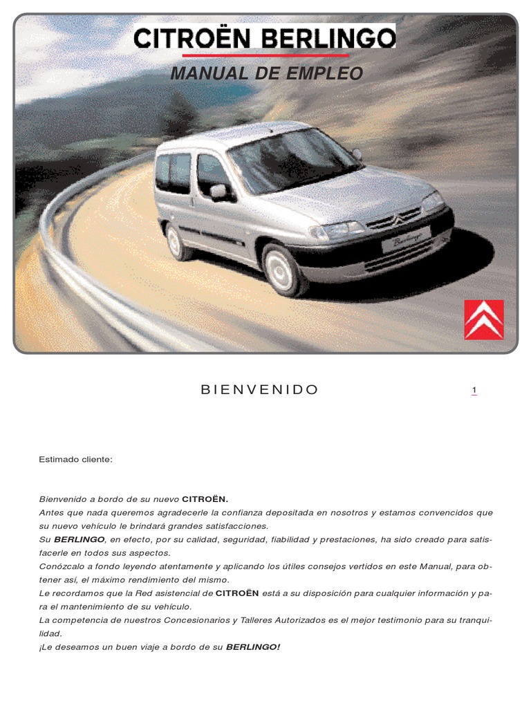 Bienvenido a bordo de su nuevo CITRON. Antes que nada queremos agradecerle la confianza depositada en nosotros y estamos convencidos que su nuevo vehculo le brindar grandes satisfacciones. Su BERLINGO, en efecto, por su calidad, seguridad, fiabilidad y prestaciones, ha sido creado para satisfacerle en todos sus aspectos. Conzcalo a fondo leyendo atentamente y aplicando los tiles consejos vertidos en este Manual, para obtener as, el mximo rendimiento del mismo. Le recordamos que la Red asistencial de CITRON est a su disposicin para cualquier informacin y para el mantenimiento de su vehculo. La competencia de nuestros Concesionarios y Talleres Autorizados es el mejor testimonio para su tranquilidad. Le deseamos un buen viaje a bordo de su BERLINGO!