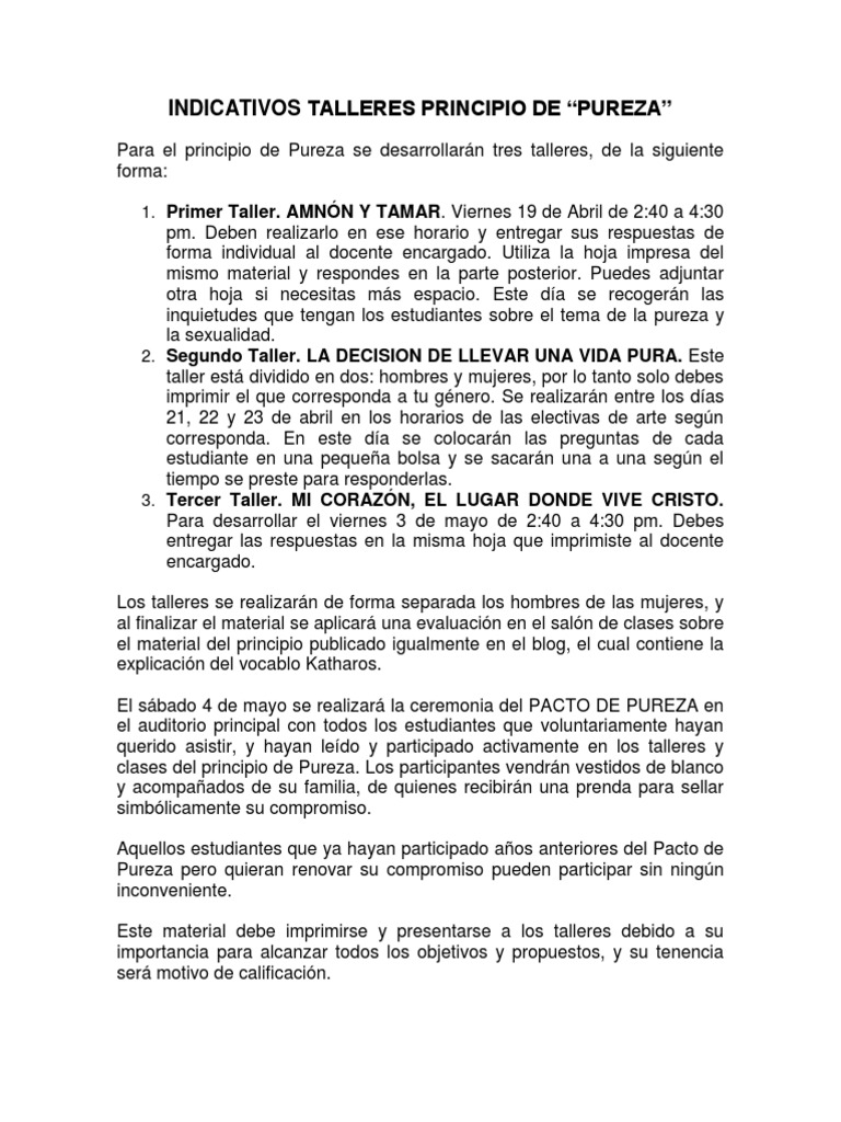 pm. Deben realizarlo en ese horario y entregar sus respuestas de forma individual al docente encargado. Utiliza la hoja impresa del mismo material y respondes en la parte posterior. Puedes adjuntar otra hoja si necesitas ms espacio. Este da se recogern las inquietudes que tengan los estudiantes sobre el tema de la pureza y la sexualidad. 2. Segundo Taller. LA DECISION DE LLEVAR UNA VIDA PURA. Este taller est dividido en dos: hombres y mujeres, por lo tanto solo debes imprimir el que corresponda a tu gnero. Se realizarn entre los das 21, 22 y 23 de abril en los horarios de las electivas de arte segn corresponda. En este da se colocarn las preguntas de cada estudiante en una pequea bolsa y se sacarn una a una segn el tiempo se preste para responderlas. 3. Tercer Taller. MI CORAZN, EL LUGAR DONDE VIVE CRISTO. Para desarrollar el viernes 3 de mayo de 2:40 a 4:30 pm. Debes entregar las respuestas en la misma hoja que imprimiste al docente encargado. Los talleres se realizarn de forma separada los hombres de las mujeres, y al finalizar el material se aplicar una evaluacin en el saln de clases sobre el material del principio publicado igualmente en el blog, el cual contiene la explicacin del vocablo Katharos. El sbado 4 de mayo se realizar la ceremonia del PACTO DE PUREZA en el auditorio principal con todos los estudiantes que voluntariamente hayan querido asistir, y hayan ledo y participado activamente en los talleres y clases del principio de Pureza. Los participantes vendrn vestidos de blanco y acompaados de su familia, de quienes recibirn una prenda para sellar simblicamente su compromiso. Aquellos estudiantes que ya hayan participado aos anteriores del Pacto de Pureza pero quieran renovar su compromiso pueden participar sin ningn inconveniente. Este material debe imprimirse y presentarse a los talleres debido a su importancia para alcanzar todos los objetivos y propuestos, y su tenencia ser motivo de calificacin.