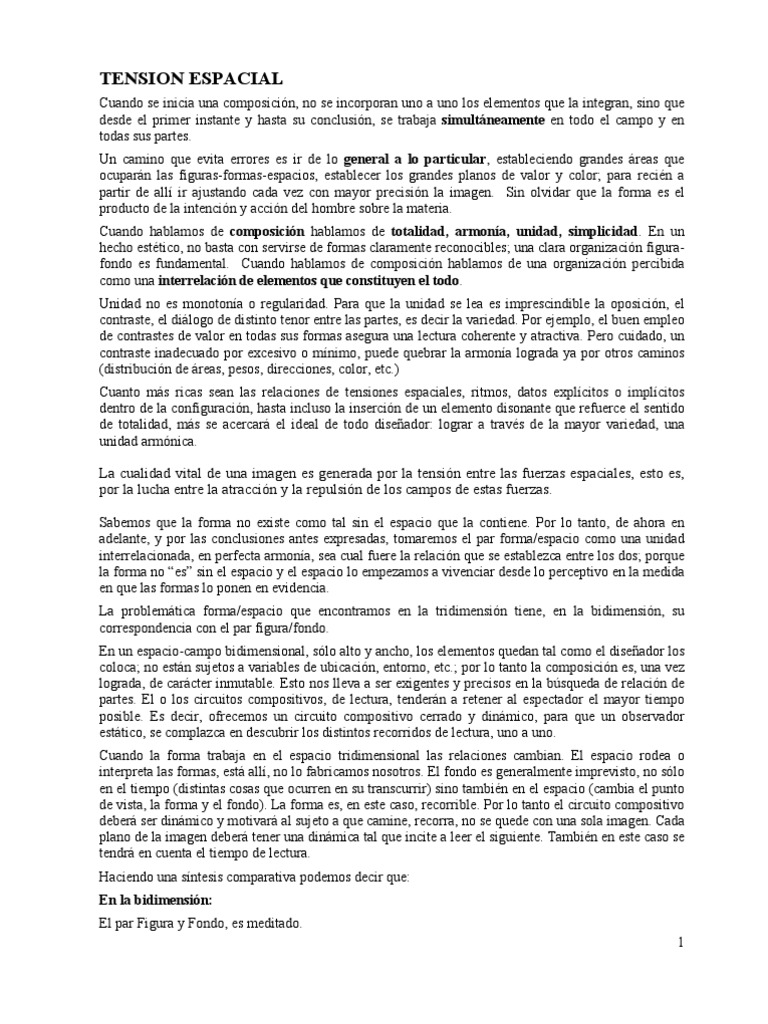 Leemos en el Lxico Tecnico de las Artes Grficas (Ferrarrio-Crespi, p. 117/118) Tensin: Fuerza psicolgica real. Es una sugerencia de fuerza que se evidencia en las direcciones de las formas las que tienden a dirigirse hacia aquellos lugares en que se acenta su 2