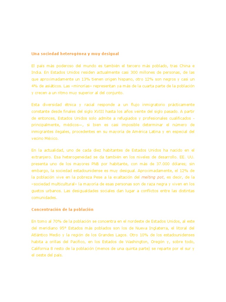 debido a su poder econmico, poltico y militar, y tambin a su influencia cultural. Una sociedad heterognea y muy desigual El pas ms poderoso del mundo es tambin el tercero ms poblado, tras China e India. En Estados Unidos residen actualmente casi 300 millones de personas, de las que aproximadamente un 13% tienen origen hispano, otro 12% son negros y casi un 4% de asiticos. Las minoras representan ya ms de la cuarta parte de la poblacin y crecen a un ritmo muy superior al del conjunto. Esta diversidad tnica y racial responde a un flujo inmigratorio prcticamente constante desde finales del siglo XVIII hasta los aos veinte del siglo pasado. A partir de entonces, Estados Unidos solo admite a refugiados y profesionales cualificados principalmente, mdicos, si bien es casi imposible determinar el nmero de inmigrantes ilegales, procedentes en su mayora de Amrica Latina y en especial del vecino Mxico. En la actualidad, uno de cada diez habitantes de Estados Unidos ha nacido en el extranjero. Esa heterogeneidad se da tambin en los niveles de desarrollo. EE. UU. presenta uno de los mayores PNB por habitante, con ms de 37.000 dlares; sin embargo, la sociedad estadounidense es muy desigual. Aproximadamente, el 12% de la poblacin vive en la pobreza Pese a la exaltacin del melting pot, es decir, de la sociedad multicultural la mayora de esas personas son de raza negra y viven en los guetos urbanos. Las desigualdades sociales dan lugar a conflictos entre las distintas comunidades. Concentracin de la poblacin En tomo al 70% de la poblacin se concentra en el nordeste de Estados Unidos, al este del meridiano 95 Estados ms poblados son los de Nueva Inglaterra, el litoral del Atlntico Medio y la regin de los Grandes Lagos. Otro 10% de los estadounidenses habita a orillas del Pacifico, en los Estados de Washington, Oregn y, sobre todo, California 8 resto de la poblacin (menos de una quinta parte) se reparte por el sur y el oeste del pas.