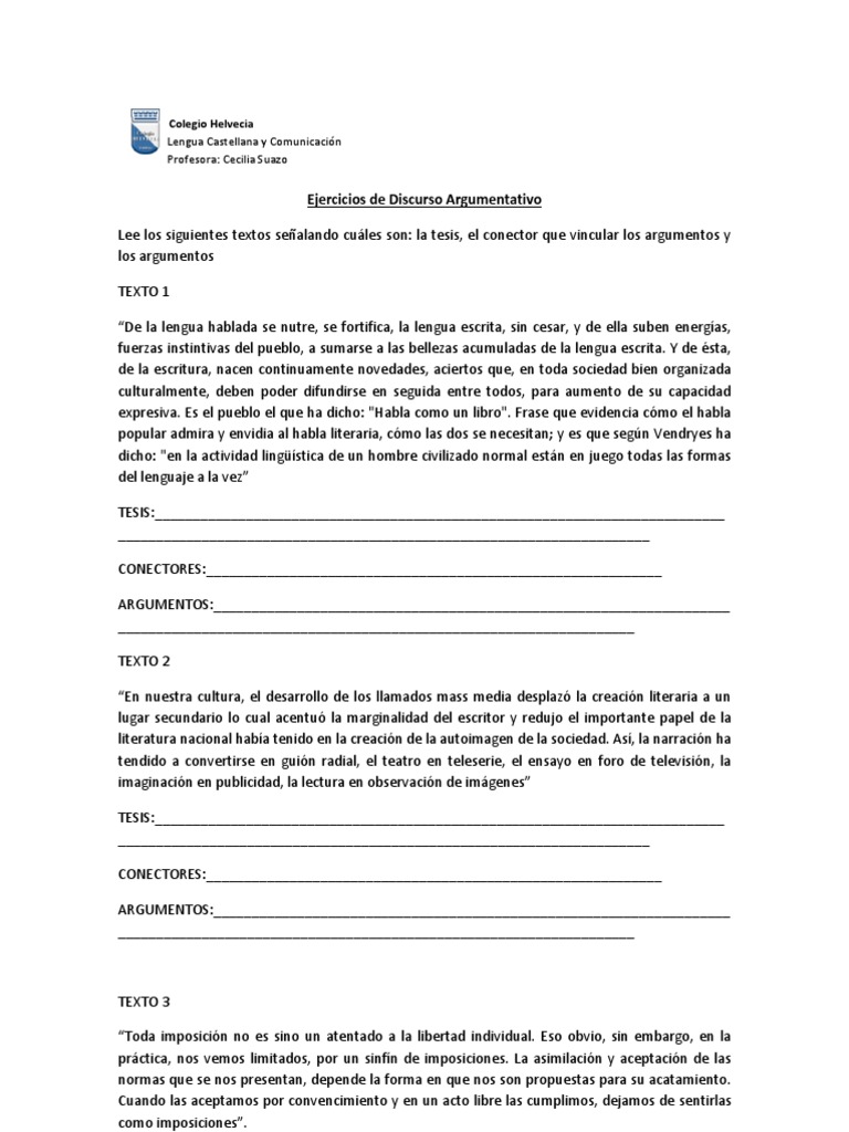 Ejercicios de Discurso Argumentativo Lee los siguientes textos sealando cules son: la tesis, el conector que vincular los argumentos y los argumentos TEXTO 1 De la lengua hablada se nutre, se fortifica, la lengua escrita, sin cesar, y de ella suben energas, fuerzas instintivas del pueblo, a sumarse a las bellezas acumuladas de la lengua escrita. Y de sta, de la escritura, nacen continuamente novedades, aciertos que, en toda sociedad bien organizada culturalmente, deben poder difundirse en seguida entre todos, para aumento de su capacidad expresiva. Es el pueblo el que ha dicho: "Habla como un libro". Frase que evidencia cmo el habla popular admira y envidia al habla literaria, cmo las dos se necesitan; y es que segn Vendryes ha dicho: "en la actividad lingstica de un hombre civilizado normal estn en juego todas las formas del lenguaje a la vez TESIS:___________________________________________________________________________ ______________________________________________________________________ CONECTORES:____________________________________________________________ ARGUMENTOS:____________________________________________________________________ ____________________________________________________________________ TEXTO 2 En nuestra cultura, el desarrollo de los llamados mass media desplaz la creacin literaria a un lugar secundario lo cual acentu la marginalidad del escritor y redujo el importante papel de la literatura nacional haba tenido en la creacin de la autoimagen de la sociedad. As, la narracin ha tendido a convertirse en guin radial, el teatro en teleserie, el ensayo en foro de televisin, la imaginacin en publicidad, la lectura en observacin de imgenes TESIS:___________________________________________________________________________ ______________________________________________________________________ CONECTORES:____________________________________________________________ ARGUMENTOS:____________________________________________________________________ ____________________________________________________________________