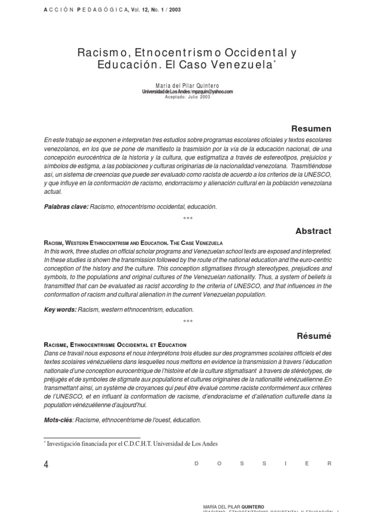 R ACISME, E THNOCENTRISME O CCIDENTAL ET E DUCATION Dans ce travail nous exposons et nous interprtons trois tudes sur des programmes scolaires officiels et des textes scolaires vnzuliens dans lesquelles nous mettons en evidence la transmission travers lducation nationale dune conception eurocentrique de lhistoire et de la culture stigmatisant travers de strotypes, de prjugs et de symboles de stigmate aux populations et cultures originaires de la nationalit vnzulienne.En transmettant ainsi, un systme de croyances qui peut tre valu comme raciste conformment aux critres de lUNESCO, et en influant la conformation de racisme, dendoracisme et dalination culturelle dans la population vnzulienne daujourdhui. Mots-cls: Racisme, ethnocentrisme de l'ouest, ducation.