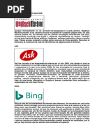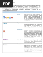 bsquedas las efecta en sitios que contienen utilizar, ya sea en la Web generalizada, informacin pblica. Yahoo News, Wiki, Google, etc A esto podemos aadirle, una barra lateral izquierda donde se sitan tres pestaas que nos YACY clasifican los resultados por tpicos, fuentes y [Link] dominios. Podemos sealar a este buscador Busquedas Web hechas por la gente, para la como una muy til herramienta por su gente. YaCy es un motor de busqueda capacidad de ordenar los resultados. gratuito al que todos pueden utilizar para crear un portal de busqueda para su intranet o para ayudar a buscar en Internet pblica. BAIDU Cuando contribuyes con la red mundial de [Link] peering, la escala de YaCy se v limitada solo Baidu es un motor de bsqueda en idioma por el nmero de usuarios en el mundo y chino con sede en Pekn fundado a finales de puede indexar miles millones de sitios web. 1999 por Robin Li y Eric Xu. Su diseo es Es enteramente descentralizado, todos los similar al de Google e incluye la posibilidad usuarios de la red del motor de busqueda son de bsqueda de noticias, imgenes y iguales, la red no almacenada pedidos de canciones, entre otras funciones. Su nombre bsqueda del usuario y no es posible para proviene de un poema chino clsico del poeta nadie censurar el contenido del indice Xin Qiji, durante la dinasta Song, acerca de compartido. Queremos lograr la libertad de un hombre que buscaba el amor de su vida. informacion por medio de, un motor de Quiz la caracterstica ms popular de Baidu, busqueda compartido cuya potencia esta dada que otros motores de bsqueda como Google por los usuarios a lo largo del mundo. no ofrecen, es la posibilidad de efectuar bsquedas de archivos de audio (MP3, WMA/SWF...). Es usada fundamentalmente HAKIA para la bsqueda de msica pop china, y los [Link] resultados de la bsqueda son Se autodefine como "el primer buscador sorprendentemente precisos. Baidu puede basado en significados", y que utiliza "un sistema semntico propietario, en lugar de los realizar estas bsquedas debido a que las leyes de la Repblica Popular China no ndices convencionales" para responder a preguntas escritas directamente en lenguaje prohben poner msica en Internet, y Baidu natural. El proyecto Hakia est dirigido por se encuentra bajo jurisdiccin china. Con un 80% de mercado en China, y gestionado por Riza Berkan, experto en Inteligencia el segundo hombre ms rico del pas, segn Artificial y Procesamiento del Lenguaje Forbes, el buscador Baidu desea ampliar su Natural, que afirma que la tecnologa desarrollada permitir rastrear los contenidos campo de accin, para internacionalizarlo. (Ms informacin) de texto de la WWW para analizarla semnticamente y poder devolver informacin a consultas efectuadas por los BLEKKO usuarios. Su similitud con los procesos [Link] cognoscitivos naturales humanos aportan un Blekko es un buscador de internet enorme beneficio, se incrementa tambin la estadounidense lanzado al pblico el 1 de eficiencia de la bsqueda y es mayor el valor noviembre de 2010. Se caracteriza por usar de la informacin recuperada, con etiquetas, slashtags en su jerga, para restringir los resultados a temas concretos. La empresa