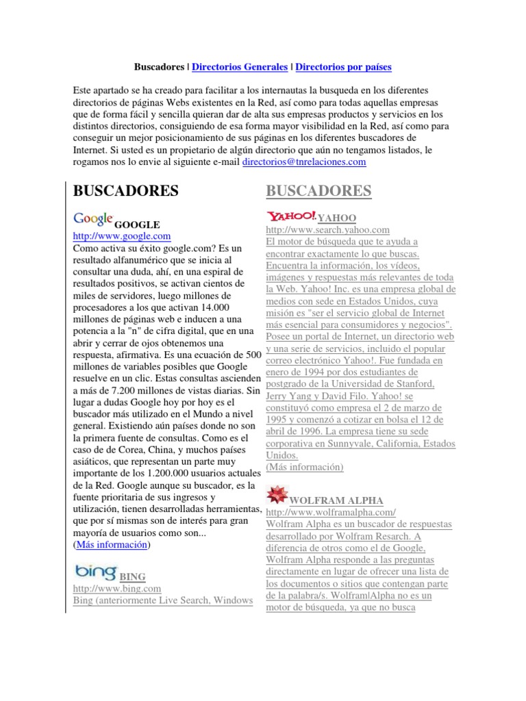 YAHOO [Link] El motor de bsqueda que te ayuda a encontrar exactamente lo que buscas. Encuentra la informacin, los vdeos, imgenes y respuestas ms relevantes de toda la Web. Yahoo! Inc. es una empresa global de medios con sede en Estados Unidos, cuya misin es "ser el servicio global de Internet ms esencial para consumidores y negocios". Posee un portal de Internet, un directorio web y una serie de servicios, incluido el popular correo electrnico Yahoo!. Fue fundada en enero de 1994 por dos estudiantes de postgrado de la Universidad de Stanford, Jerry Yang y David Filo. Yahoo! se constituy como empresa el 2 de marzo de 1995 y comenz a cotizar en bolsa el 12 de abril de 1996. La empresa tiene su sede corporativa en Sunnyvale, California, Estados Unidos. (Ms informacin) WOLFRAM ALPHA [Link] Wolfram Alpha es un buscador de respuestas desarrollado por Wolfram Resarch. A diferencia de otros como el de Google, Wolfram Alpha responde a las preguntas directamente en lugar de ofrecer una lista de los documentos o sitios que contengan parte de la palabra/s. Wolfram|Alpha no es un motor de bsqueda, ya que no busca
