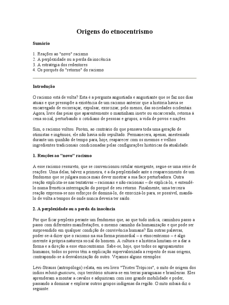 Introduo O racismo est de volta? Esta a pergunta angustiada e angustiante que se faz nos dias atuais e que pressupe a existncia de um racismo anterior que a histria havia se encarregado de escorraar, expulsar, exorcizar, pelo menos, das sociedades ocidentais. Agora, livre das peias que aparentemente o mantinham inerte ou encarcerado, retorna cena social, perturbando o cotidiano de pessoas e grupos, a vida de povos e naes. Sim, o racismo voltou. Porm, ao contrrio do que pensava toda uma gerao de otimistas e ingnuos, ele no havia sido sepultado. Permanecera, apenas, anestesiado durante um quinho de tempo para, hoje, reaparecer com os mesmos e velhos ingredientes tradicionais condicionadas pelas configuraes histricas da atualidade. 1. Reaes ao "novo" racismo A esse racismo ressureto, que se convencionou rotular emergente, segue-se uma srie de reaes. Uma delas, talvez a primeira, a da perplexidade ante o reaparecimento de um fenmeno que se julgara nunca mais dever mostrar a sua face perturbadora. Outra reao explicita-se nas tentativas racionais e no-racionais de explic-lo, e entendlo numa frentica interrogao do porqu de seu retorno. Finalmente, uma terceira reao expressa-se nos esforos de domin-lo, de exorciz-lo para, se possvel, mandlo de volta a tempos de onde nunca deveria ter sado. 2. A perplexidade ou a perda da inocncia Por que ficar perplexo perante um fenmeno que, ao que tudo indica, caminhou passo a passo com diferentes manifestaes, o mesmo caminho da humanizao e que pode ser surpreendido em qualquer condio de convivncia humana? Em outras palavras, poder-se- dizer que o racismo na sua forma primordial o etnocentrismo algo inerente prpria natureza social do homem. A cultura e a histria limitam-se a dar a forma e a direo a esse etnocentrismo. Sabe-se, hoje, que todos os agrupamentos humanos, todos os povos tm a explicao supervalorizada a respeito de suas origens, contrapondo-se desvalorizao do outro. Vejamos alguns exemplos: Lvi-Strauss (antroplogo) relata, em seu livro "Tristes Trpicos", o mito de origem dos ndios mbai-guaicuru, cujo territrio situava-se em terras paraguaias e brasileiras. Eles aprenderam a montar a cavalos e adquiriram com isso grande mobilidade e poder, passando a dominar e explorar outros grupos indgenas da regio. O mito mbai diz o seguinte: