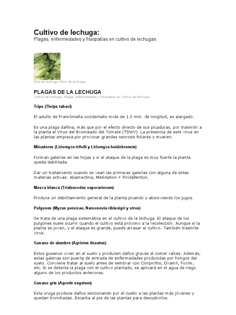 prolongada, adems las conidias del hongo son transportadas por el viento dando lugar a nuevas infecciones. Para combatir esta enfermedad se recomiendan las siguientes materias activas: Captan, Zineb, etc.. Esclerotinia (Sclerotinia sclerotiorum) Se trata de una enfermedad de suelo, por tanto las tierras nuevas estn exentas de este parsito o con infecciones muy leves. La infeccin se empieza a desarrollar sobre los tejidos cercanos al suelo, pues la zona del cuello de la planta es donde se inician y permanecen los ataques. Sobre la planta produce un marchitamiento lento en las hojas, inicindose en las ms viejas, y contina hasta que toda la planta queda afectada. En el tallo aparece un micelio algodonoso que se extiende hacia arriba en el tallo principal. Tratar con Dicloran e Iprodiona. Septoriosis (Septoria lactucae) Esta enfermedad produce manchas en las hojas inferiores. Productos: Difeconazol, Propineb + Triadimefon, Ziram Virus del Mosaico de la Lechuga (LMV) Es una de las principales virosis que afectan al cultivo de la lechuga y causa importantes daos. Se transmite por semilla y por pulgones. Los sntomas producidos pueden empezar incluso en semillero, presentando moteados y mosaicos verdosos que se van acentuando al crecer las plantas, dando lugar a una clorosis generalizada, en algunas variedades pueden presentar clorosis foliares. No tiene cura. Virus del Bronceado del Tomate (TSWV) Las infecciones causadas por este virus estn caracterizadas por manchas foliares, inicialmente clorticas, y posteriormente, necrticas e irregulares, a veces tan extensas que afectan a casi toda la planta que, en general, queda enana y se marchita en poco tiempo. Se transmite por el trips Frankliniella occidentalis al picar las hojas.