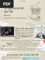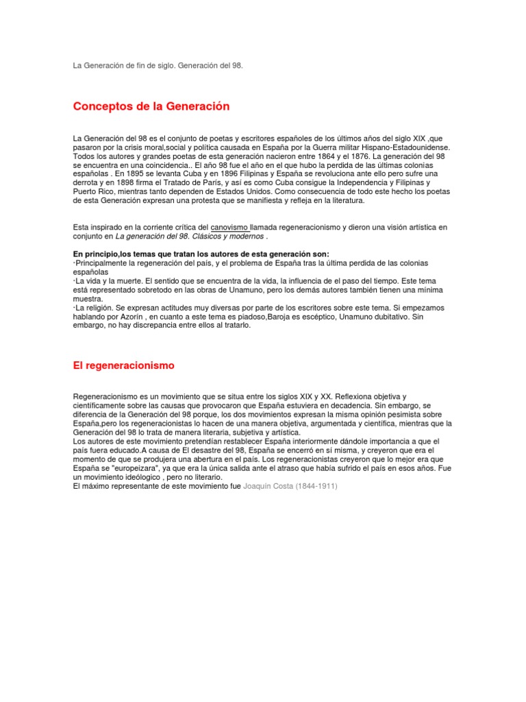 La Generacin del 98 es el conjunto de poetas y escritores espaoles de los ltimos aos del siglo XIX ,que pasaron por la crisis moral,social y poltica causada en Espaa por la Guerra militar Hispano-Estadounidense. Todos los autores y grandes poetas de esta generacin nacieron entre 1864 y el 1876. La generacin del 98 se encuentra en una coincidencia.. El ao 98 fue el ao en el que hubo la perdida de las ltimas colonias espaolas . En 1895 se levanta Cuba y en 1896 Filipinas y Espaa se revoluciona ante ello pero sufre una derrota y en 1898 firma el Tratado de Pars, y as es como Cuba consigue la Independencia y Filipinas y Puerto Rico, mientras tanto dependen de Estados Unidos. Como consecuencia de todo este hecho los poetas de esta Generacin expresan una protesta que se manifiesta y refleja en la literatura.