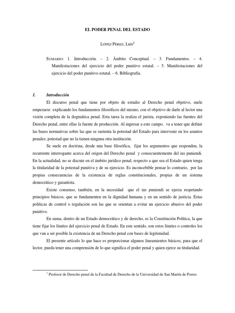 SUMARIO: 1. Introduccin. 2. mbito Conceptual. 3. Fundamentos. 4. Manifestaciones del ejercicio del poder punitivo estatal. 5. Manifestaciones del ejercicio del poder punitivo estatal. 6. Bibliografa.