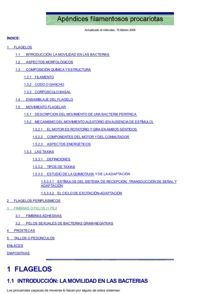 Para empezar, un artculo de una enciclopedia on-line que describe brevemente los flagelos procariotas y eucariotas. Interesantes vdeos sobre la movilidad por flagelos (Universidad de Harvard) Para no perderse: El proyecto "nanomquina" nos asombra con unos espectaculares videos en 3-D sobre el flagelo. El que trata sobre el ensamblaje es para quitarse el sombrero El profesor Howard Berg escribe una estupenda pgina sobre el flagelo y la quimiotaxis, con figuras muy instructivas El profesor Macnab, uno de los mximos especialistas en flagelos bacterianos nos deleita con una revisin centrada en el motor flagelar Una serie de imgenes tridimensionales sobre el ensamblaje del flagelo Una pgina sobre quimiotaxis mantenida por la Universidad de Bristol Una pgina sobre el curioso movimiento por sacudidas, debido a pelos de tipo IV (con videos) Una pgina sencilla sobre los distintos tipos de fimbrias y pelos (Universidad de Newcastle)